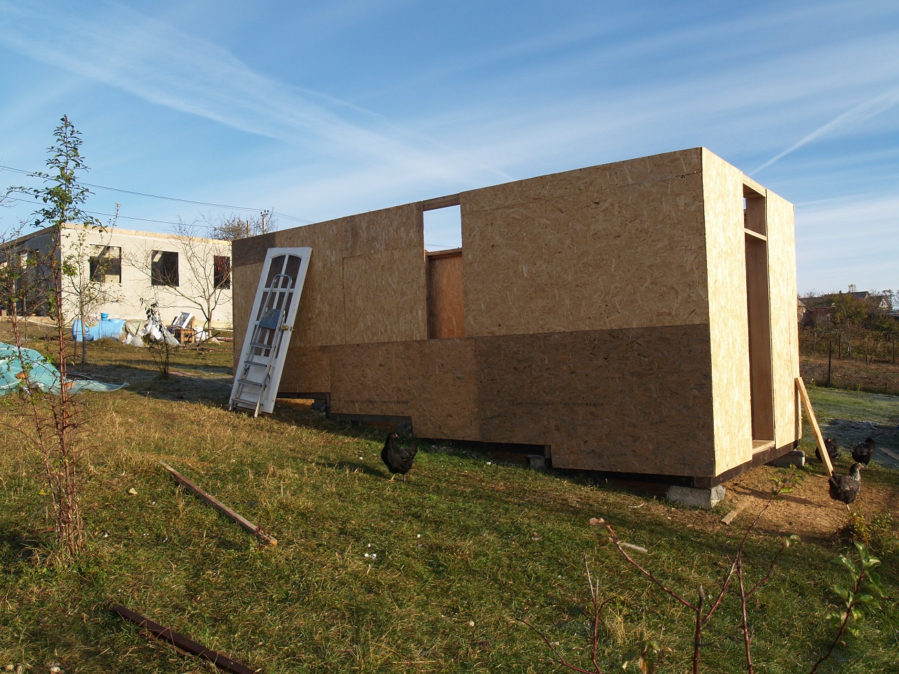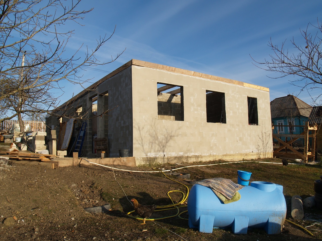 Разобрала пристройку (нанимала на демонтаж) и пристроила кухню и с/у из арболитовых блоков. Снаружи закатала 3000 клеем по фасадной сетке=гидроизоляция.