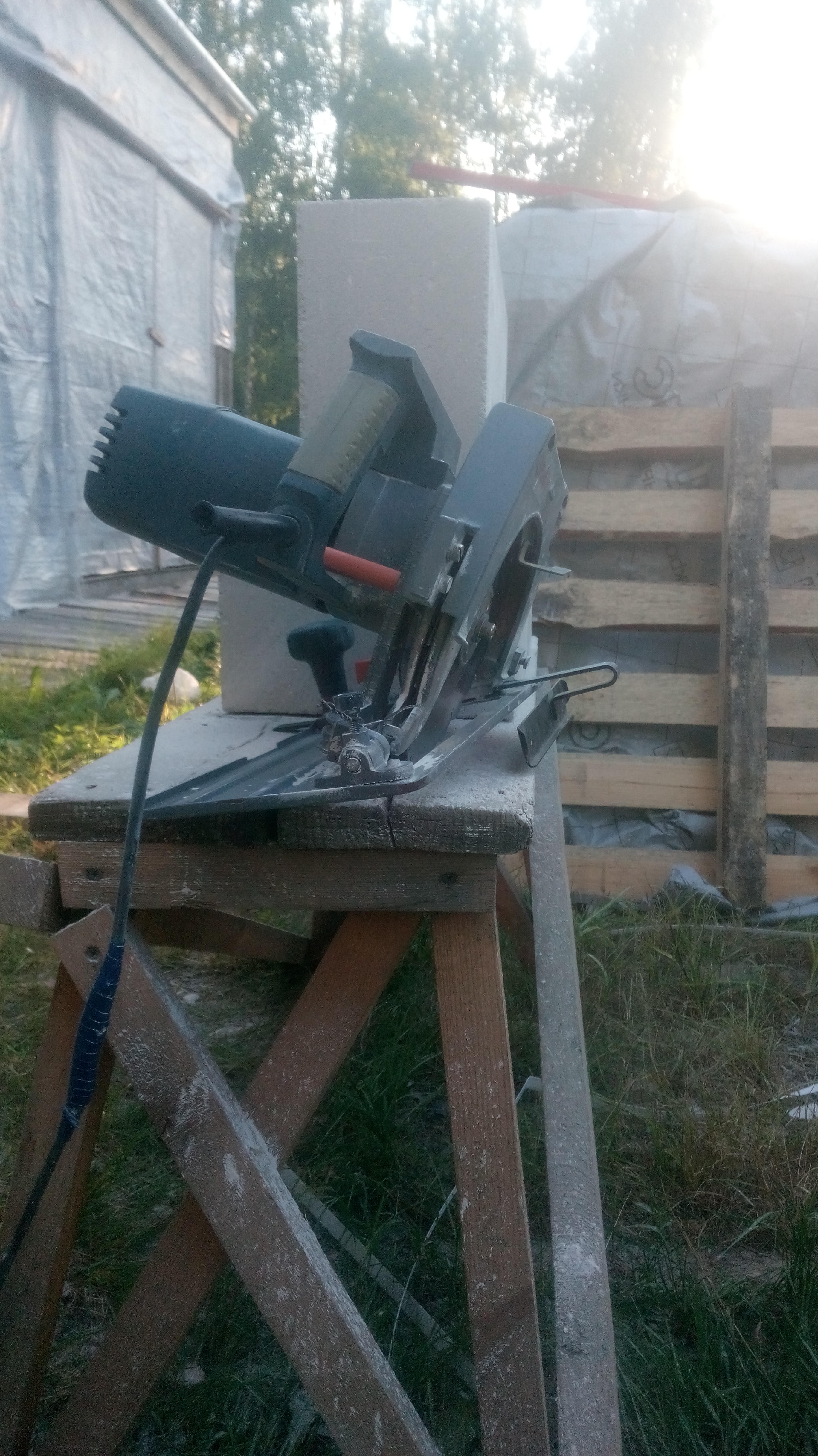 В гараже решил сделать перегородку из газобетона. Блоки 600*250*150. Кладу на клей Axton из Леруа. Каждый четвёртый ряд арматура 6мм. Паз в блоках для арматуры выпиливаю дисковой пилой.