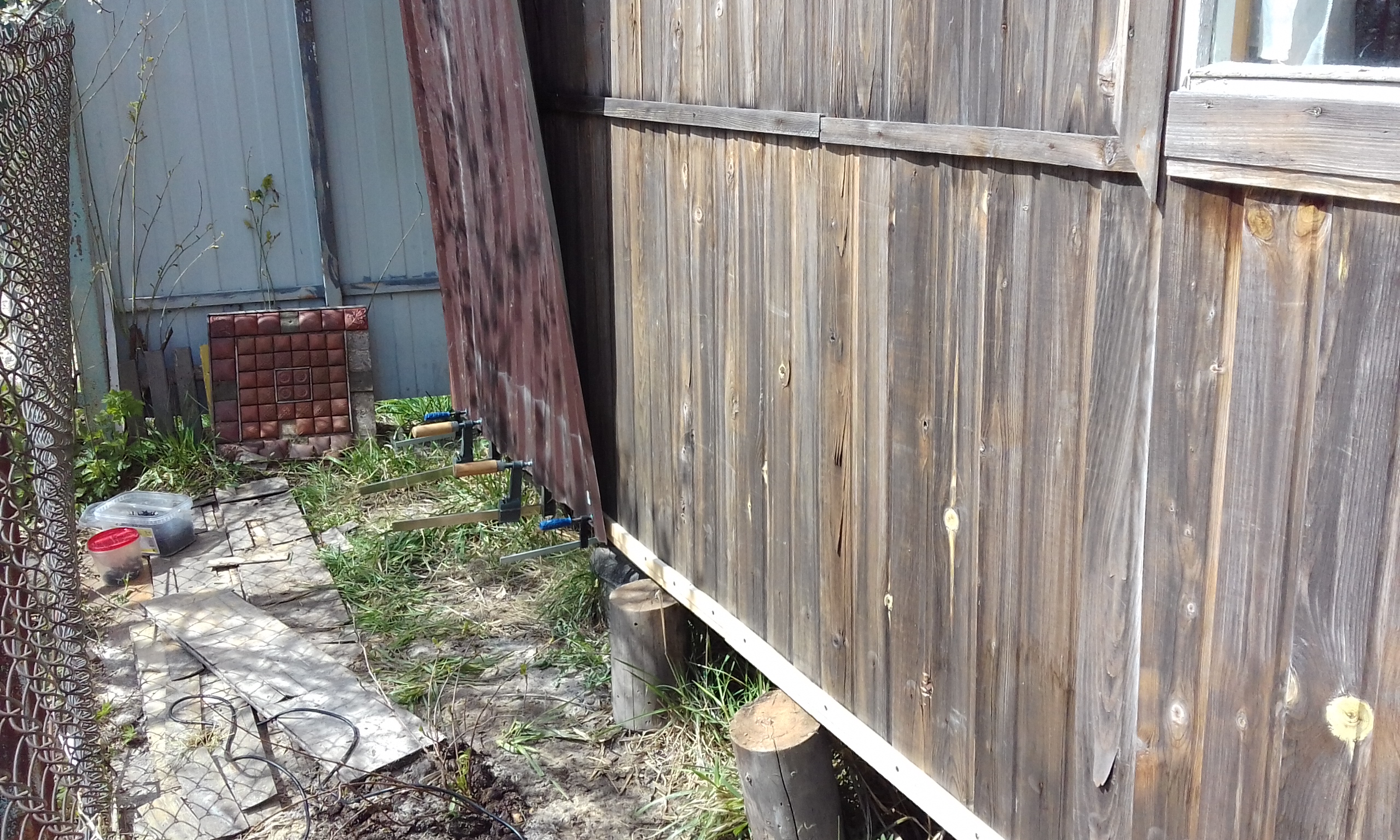 Снятые с кровли бытовки листы профнастила пустил на обшивку стен бытовки.