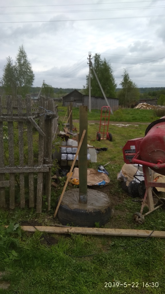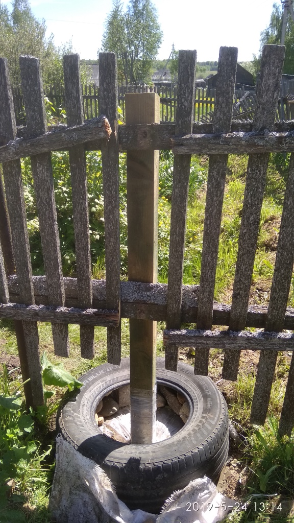 Теперь по бетону: брал 500 цемент, мешал 1:5 по объему с ПГС ом. Смесь делал жидкую, бо огромная прочность ни к чему, а затекать оно должно Итого: примерно: 15 лопат ПГС, 3 лопаты цемента, 5 л. воды. В мешалку: сначала воду, потом цемент, когда размешается -песок. На покрышку в среднем уходило треть мешка цемента да тачка в 100 кг ПГС, или 120 руб на цемент и рублей 50 на ПГС Итого за один установленный столбик рублей 300 максимум.