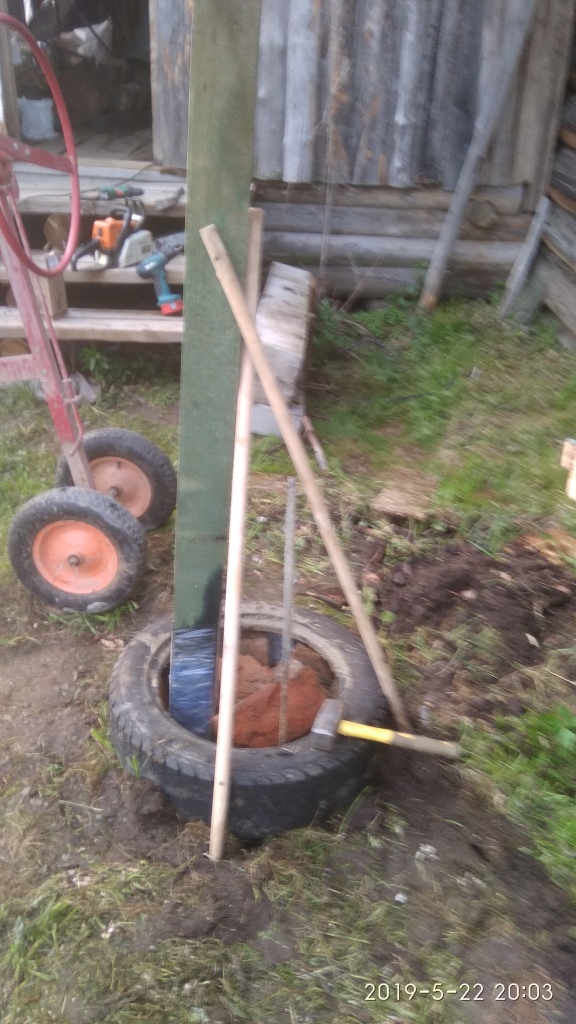 2. Покрышки выставляются на грунт со снятой плодородкой примерно в горизонте-сильно морочиться не стоит- важно как встанет столб, а если покрышка будет чуть под наклоном. то и не хуже. Будет куда воде стекать.
