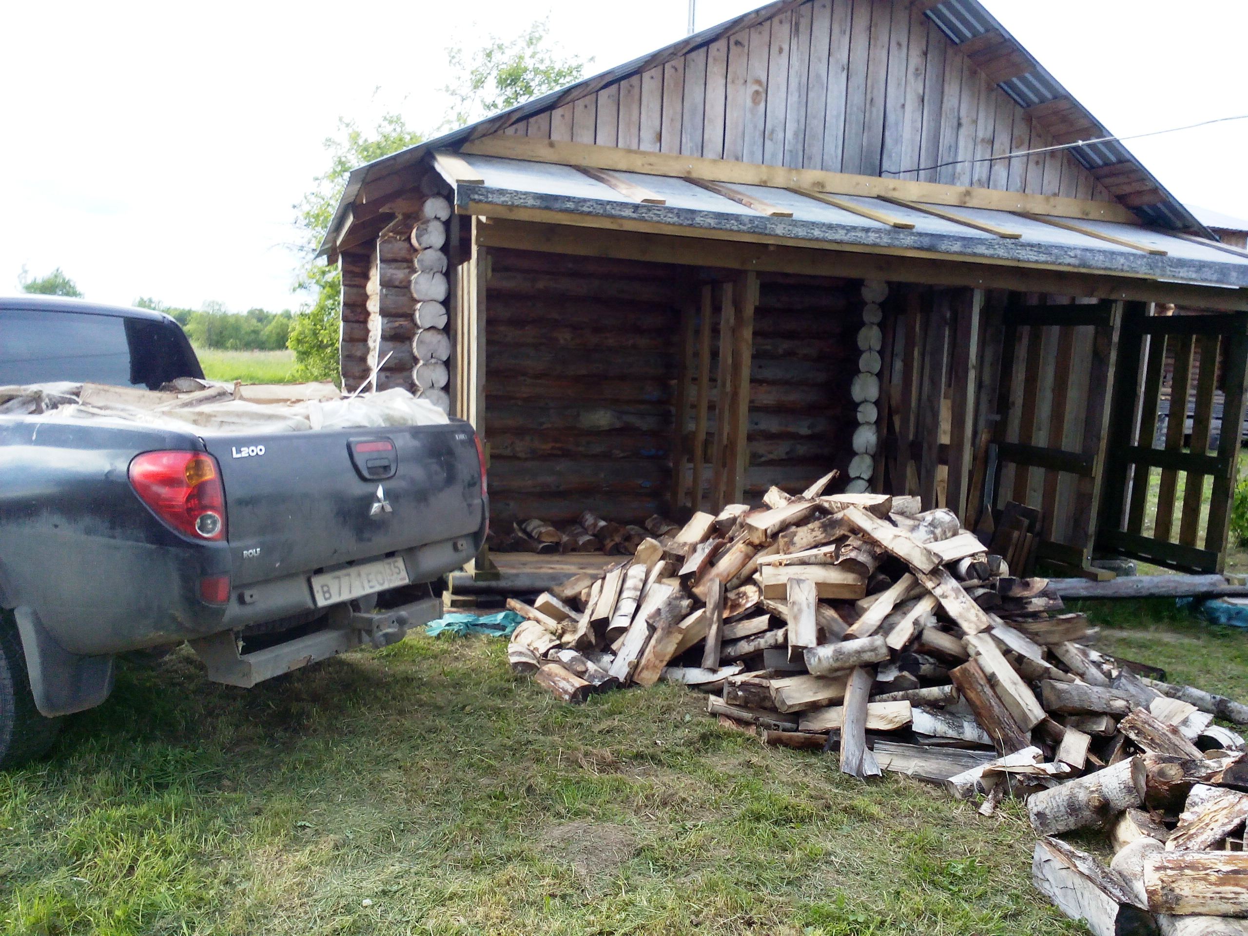 Итак от теории к практике: Так как забор прошлой весной завалился, то пришлось , как сошел снег, строить новый дровенник кубов на 10-12 и перевозить туда дрова:,