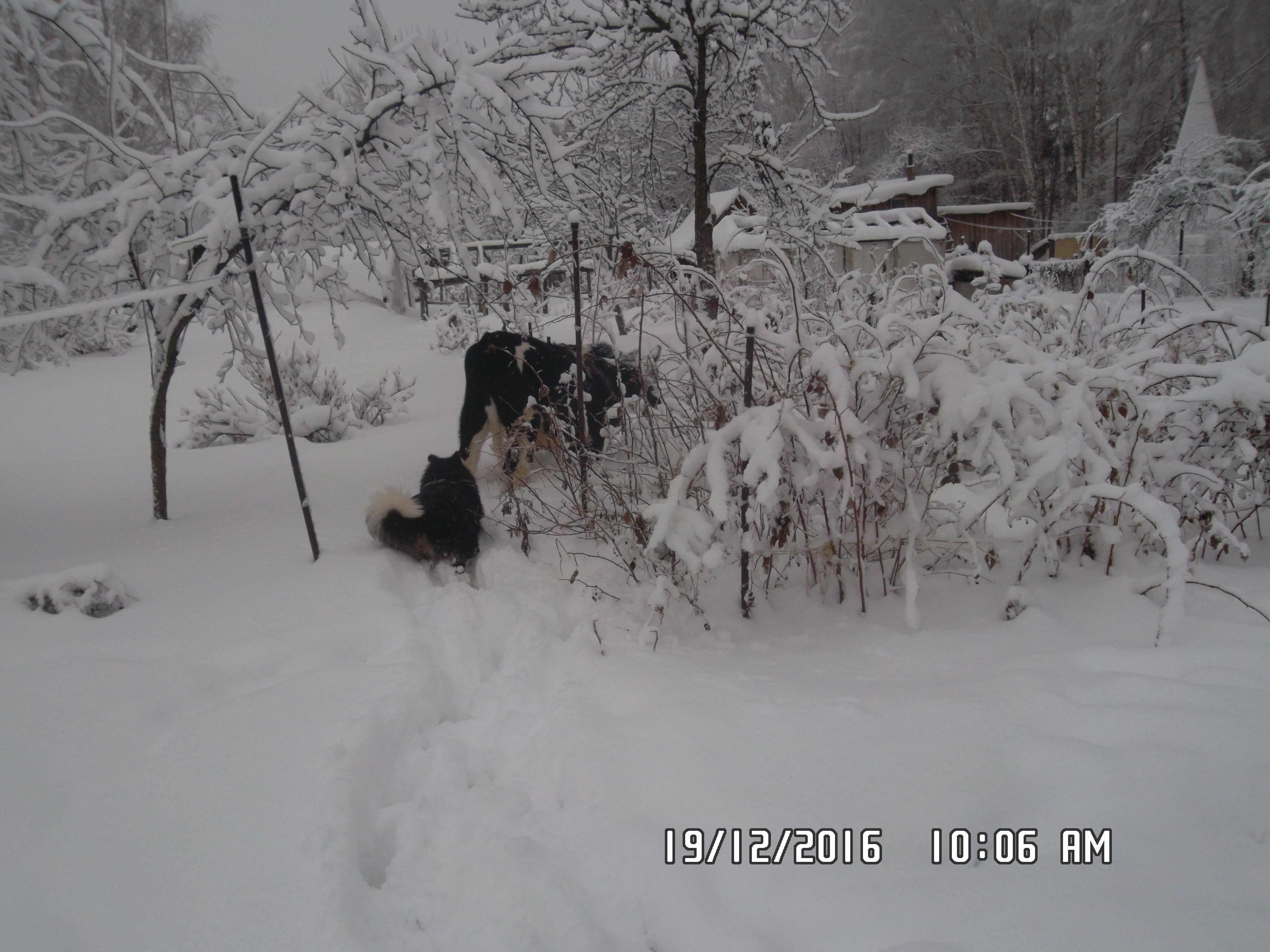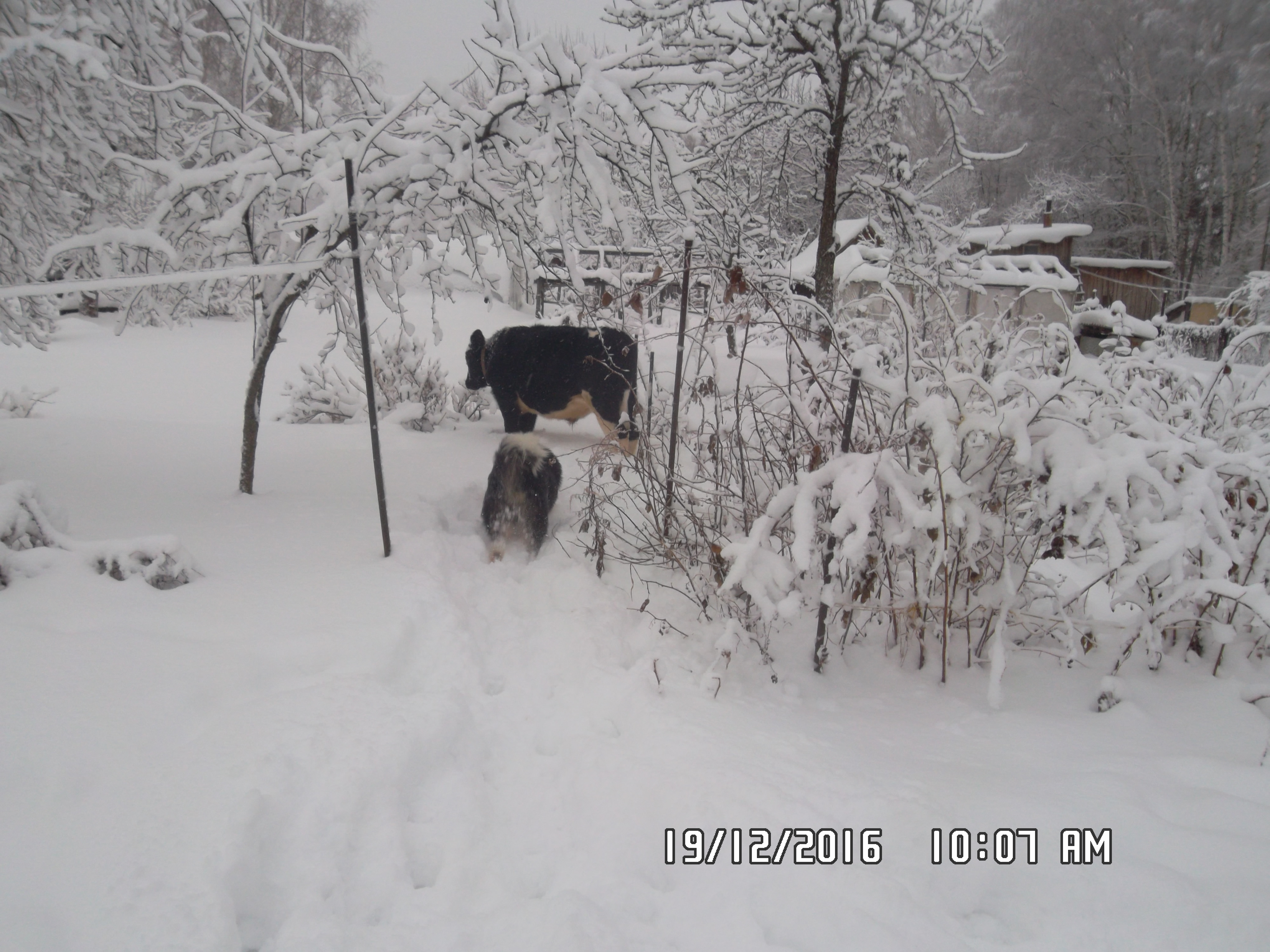 Собакин у нас, явно в супер зимнем варианте. Дома ему жарко всегда и спит он на снегу около крыльца. Его засыпает снежком, как маленький сугробик и время от времени приходится затаскивать его в дом, чтобы обсох.Он перестал есть традиционную еду, которую пожирал по приезде - кашу с мясом. Видал он ее теперь. Вчера за день спорол китайскую дохлую курицу на 2.5 кг.Сожрал вместе с перьями и ни разу не подавился. В перерывах между пожиранием курицы, он закапывал ее в снег и шел выкапывать из под снега послед. потом прятал его и переходил на курятину. В свободное время гонял кошек, которые его не очень то боятся, играл с Вьюном, гулял с быком, от которого ловко уворачивался и не давал себя боднуть.
