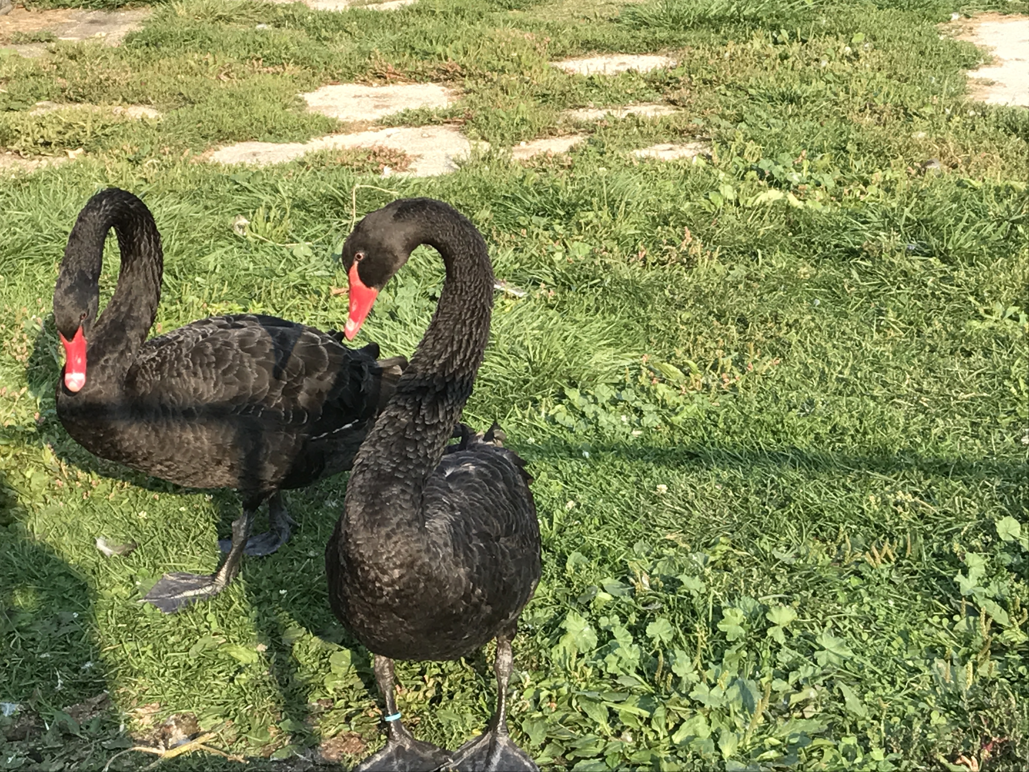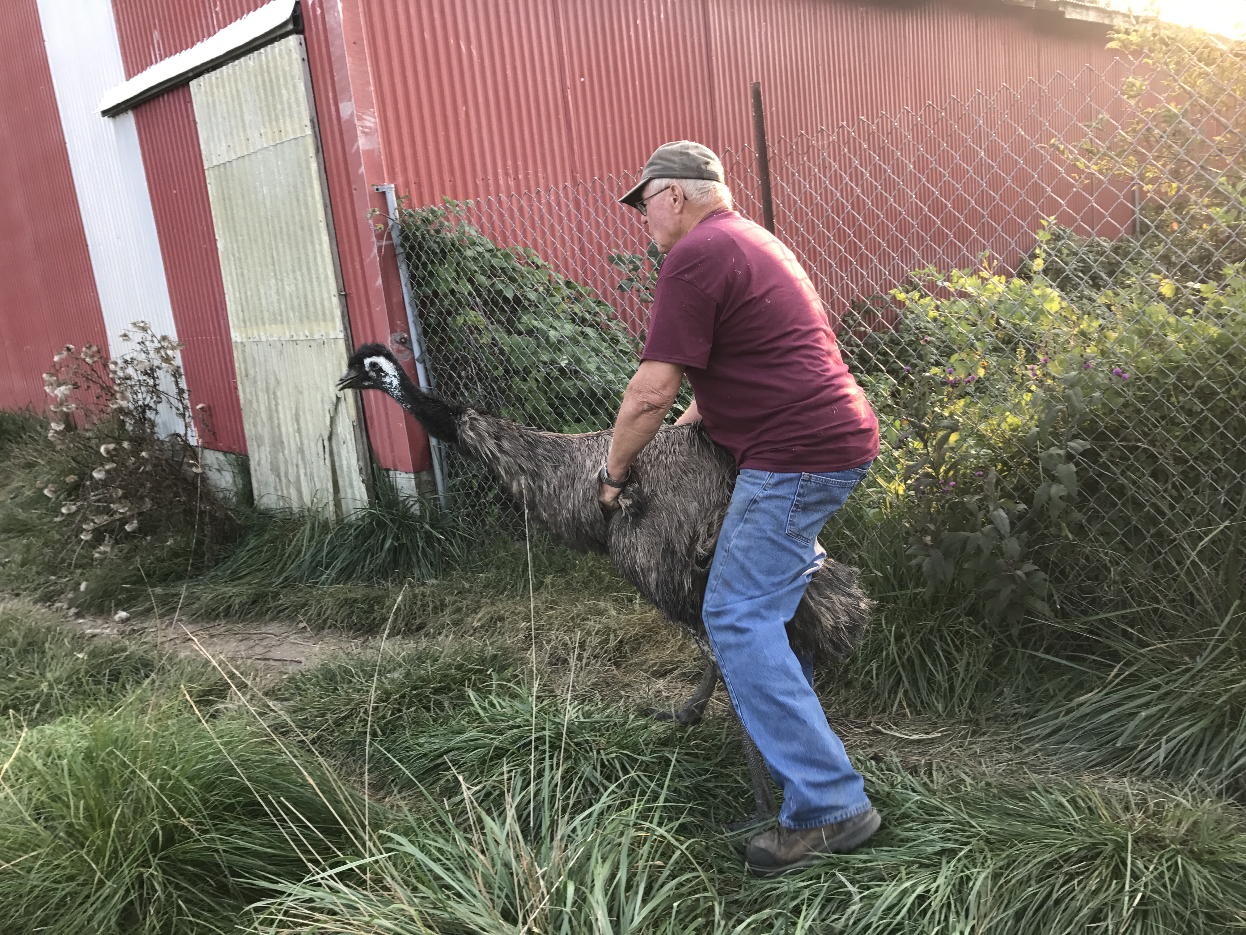 Вот так ловятся эму. Мы с мужем и не подходили, только дверку трейлера открывали внутрь закинуть птицу. За крылья и сесть на нее. И двигаться вместе. Ногами может бить вперед и вбок, назад не может, но очень-очень сильная птица. Пройти с ней так несколько шагов возможно. Владелец сам ловил и еле сдерживал. И вот такие черные австралийские лебеди у него - самые длинные из всех лебедей шеи у них.