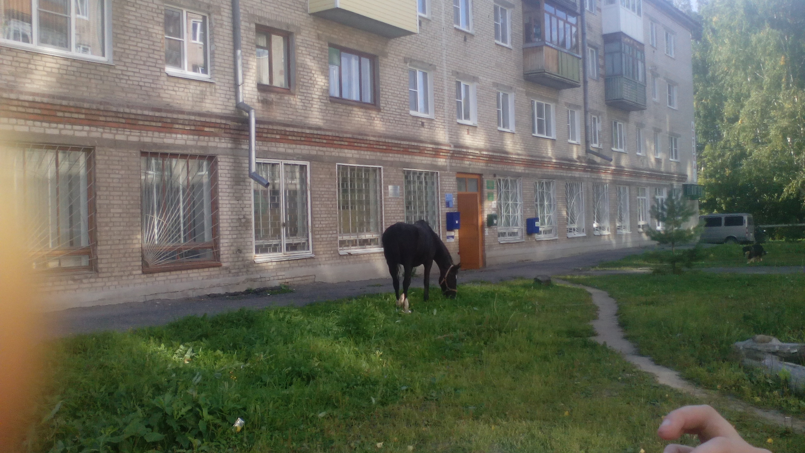 На поле трава уже не растет и мы пасемся в микрорайоне. Вот между "Магнитом" и почтой на газоне.