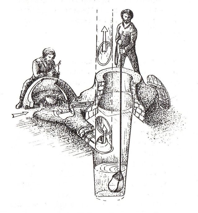 Интересна сама конструкция аркаимской печи. В ней при совмещении очага и колодца создавалась естественная и сильная воздушная тяга. Воздух, поступающий в столб колодца (на иллюстрации ниже), охлаждался расположенной в столбе колодца водой и поступал в топку. Известно, что для плавления бронзы необходима достаточно высокая температура, которую невозможно получить без подачи большого объема воздуха к месту горения.