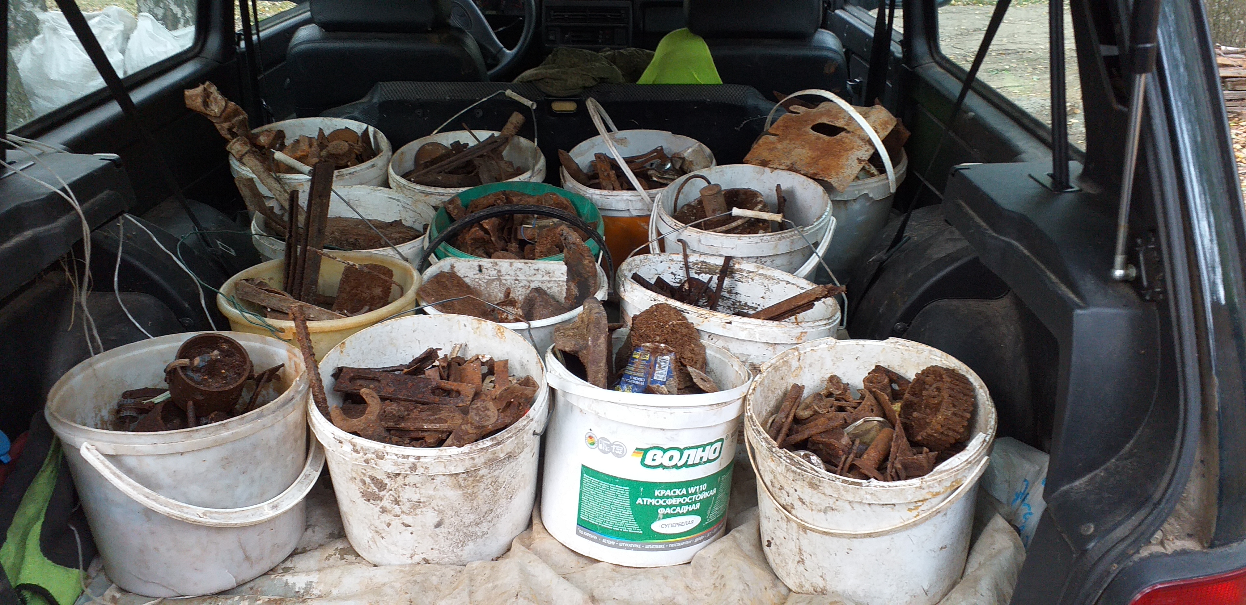 4 часа работы и вот 14 ведер железа. Вчера мы собрали 7 ведер - 100 кг на 1350 р. Сегодня только под конец мы нашли развал полный металла и понеслось.. Я натерла водяную мозоль о копалку.