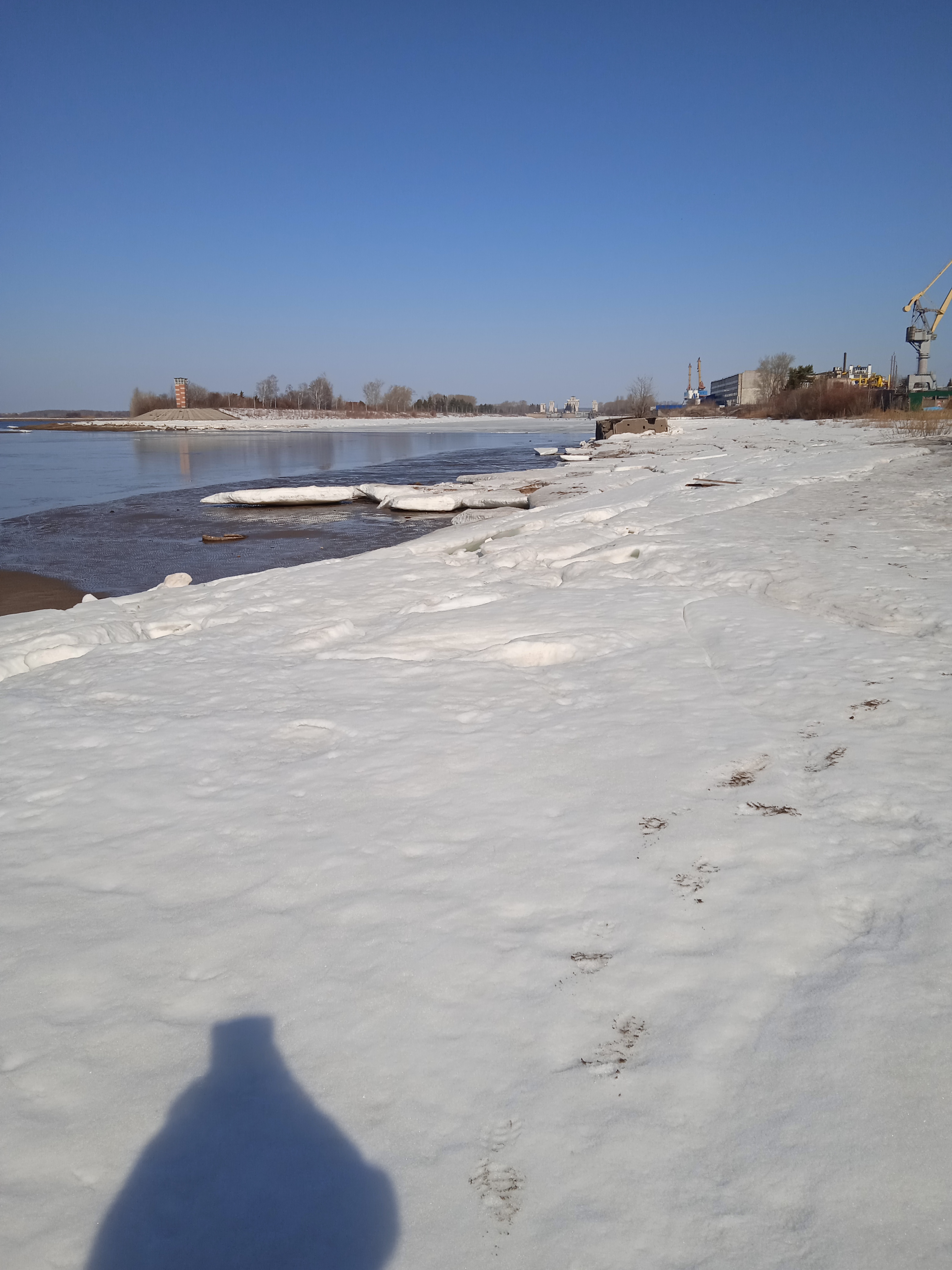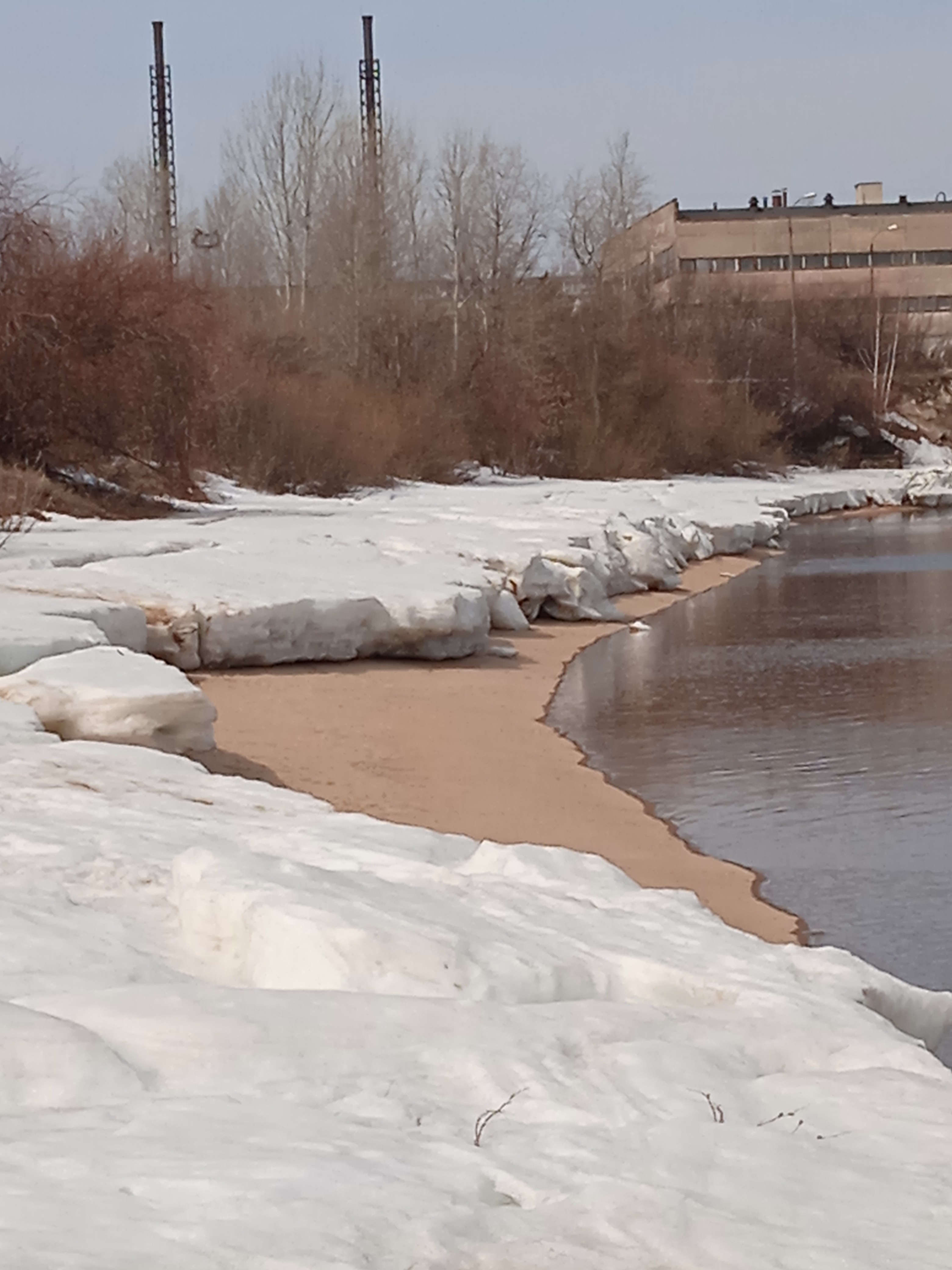 Вот, видите, между льдинами на берегу и бетонным блоком с деревом, в воде торчит прямоугольная фигня? Так вот, это лодка Казанка, она на берегу, на траве, закрепленная цепью.Так поднялась вода. Почти на 3 метра.