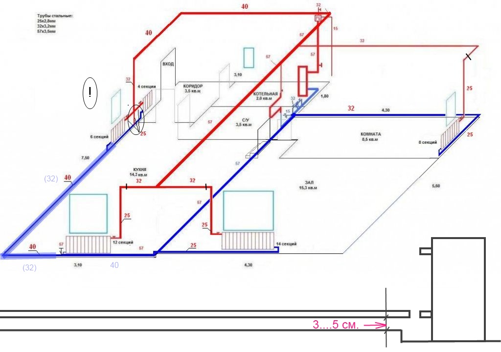 А по мне, ИМХО, все системы должны быть ремонтнопригодны. Если вдруг потечет труба в стяжке или под полом (всякое бывает) - что делать ? Пол вскрывать ? Или стяжку ? Для ЕЦ необходимое условие - чтобы система потребления тепла (трубы, батареи) находились выше источника тепла (котла). В данном случае мы имеем это условие выполненным. Далее - радиаторы ставят для лучшей конвекции воздуха, нагреваемого в батарее теплоносителем - соответственно в зависимости от оребрения конвекция хуже-лучше, ну и материал - держит тепло лучше-хуже (лучше всего старые советские чугунки - радиаторы). Весь вопрос тут в том, что хочет получить ТС - лучевое тепло или конвективное ( в смысле - теплые полы и стены или теплый воздух). Ну и наклон системы никто не отменял - 2 мм на 1 пог м - это стандарт. Для себя разрабатывала двухтрубку с ЕЦ, могу выложить схемку, которую сперла на ФХ для основы . Отказалась от неё, поскольку так и не смогла придумать, как сделать подвал под домом в углу , чтобы дом не рухнул , переделала под печки. У ТС проще - у него уже есть подвал, в котором стоит котел. Все ИМХО, сильно не ругайтесь, я не спец, просто довольно долго мучилась сама с вариантами, выбирала наиболее устойчивую и надежную, и чтоб с ЕЦ , для одноэтажного дома