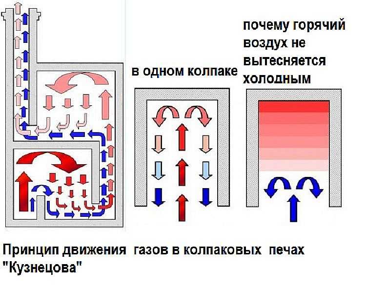 Денис,смешение холодного и горячего воздуха происходит в канальной печи,там нет возможности разделить эти два потока.В колпаковой печи они разделяются естественным образом-горячие поднимаются вверх (колпак),"холодные" (остывшие) уходят низом на картинке синие стрелки.Возьми стакан,переверни вверх дном и снизу подставь дымящую сигарету,дым заполнит объем стакана и вытеснит холодный воздух.