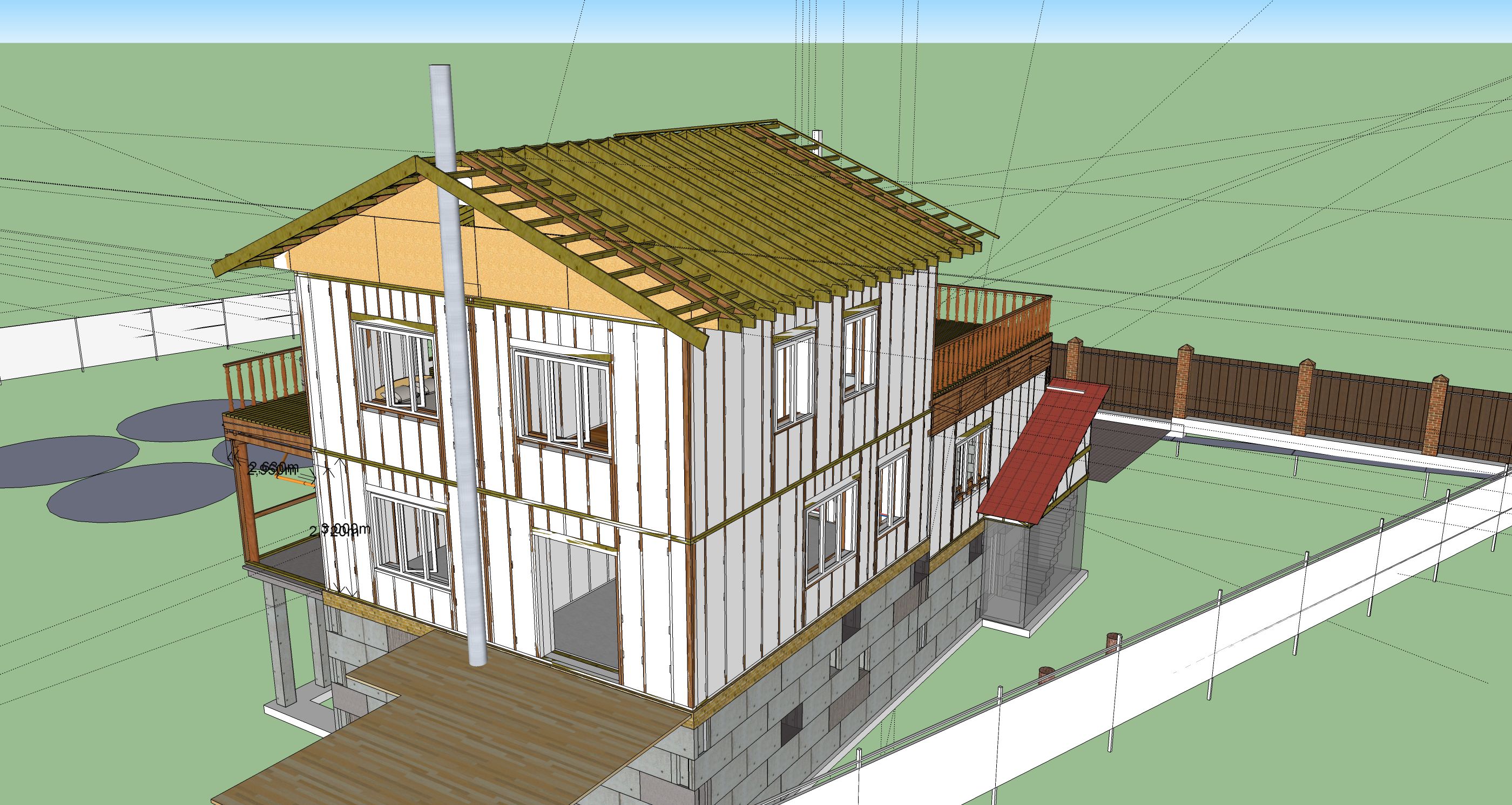 Ещё дымоход - думаю из чего сделать быстро, не дорого и чтобы на пару лет точно хватило - потом переделаю. Труба будет на улице вдоль стены, но высота 10м и выйдет практически в конёк - свеса сейчас запланированного большого хорошо что нет.