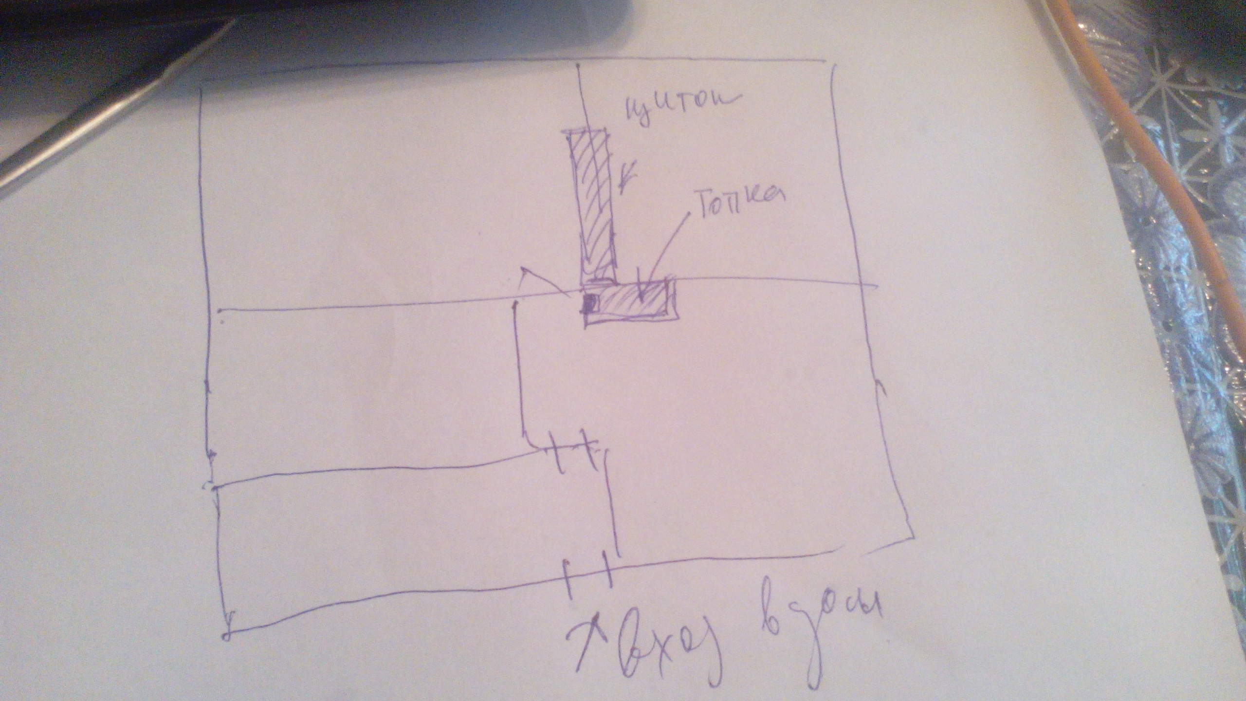 Прошу прощения за качество. Нарисовала на коленке. Дом для ПМЖ. 1 этаж. тамбур не отапливаемый. В санузле планирую теплый пол. Фундамент на покрышках)) Утеплитель - Роквул 150 в стены. Пол утеплять не хочу. Хорошо утеплю потолок. Цоколь закрою ЭППС. Плиту заливали под печь- стенку.