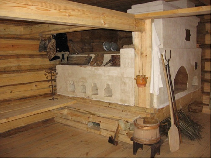 Бывало что и нет, но то в избах по черному.Если печь по черному, то на фига потолок?Слой соломы потолще для тепла, а зимой и снегу наметет..а тут печка явно с трубой и, значит, потолок есть.и вряд ли он высокий.