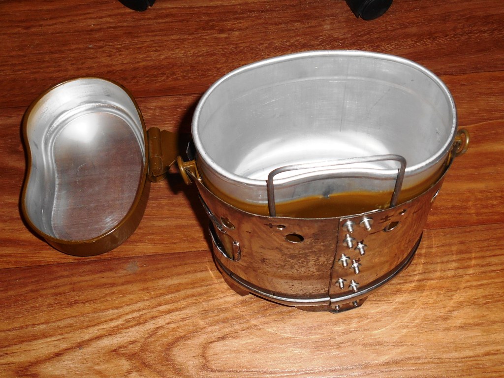 Котелок комплектуется:двумя банками тушёнки, 6 пакетами с рисом, пакетами чая или кофе и ложкой и парой Сникерсов или смесью молотых орехов и сухофруктов на меду.