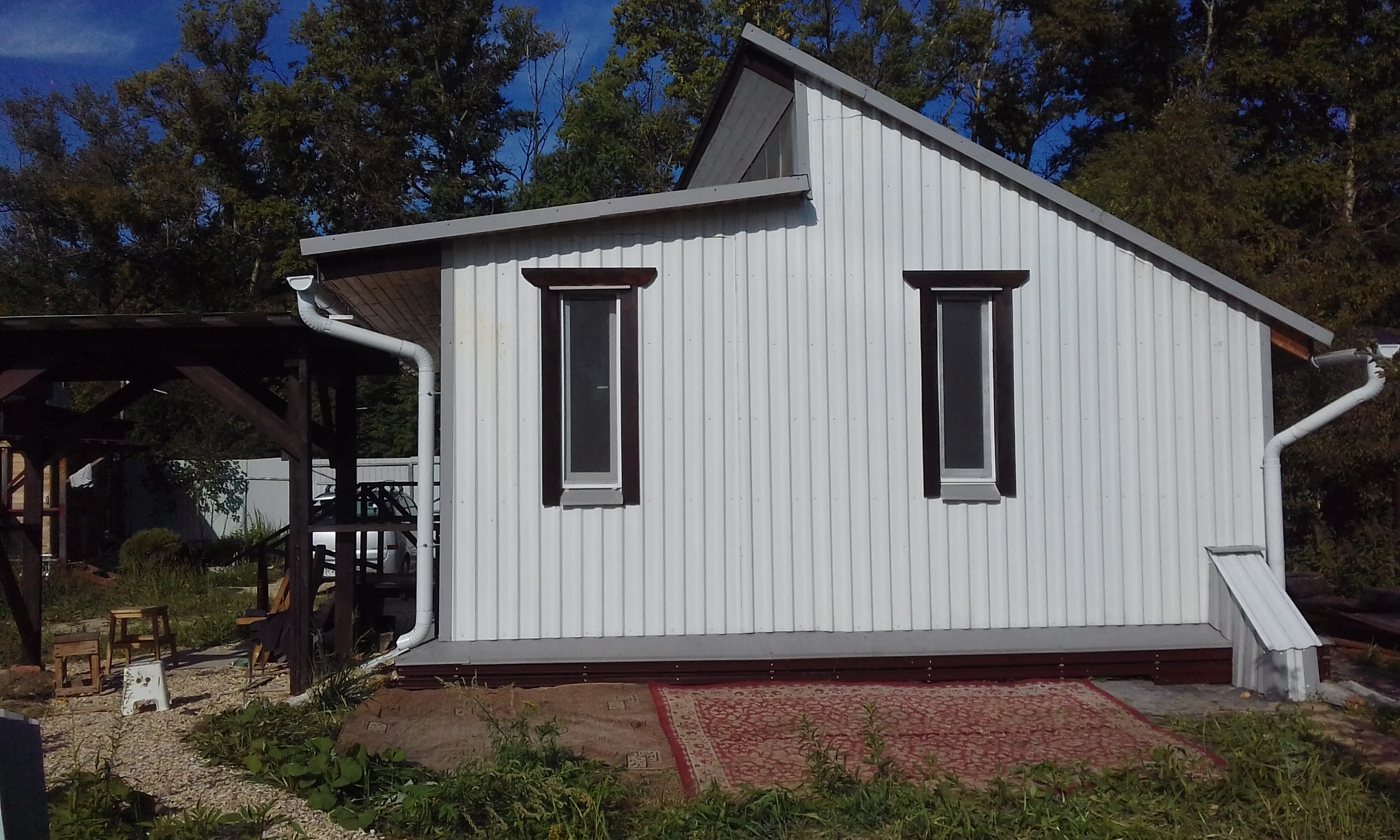 Сток продольно на участок. Уклон на фото не виден. Уклон 5 см на 330 см. Зрительно лучше когда потолок ровный, а не со скосом (хотя конечно это не очень важно). Каркас очень мощный из доски 150х50 мм и выдержит три снеговых нагрузки.