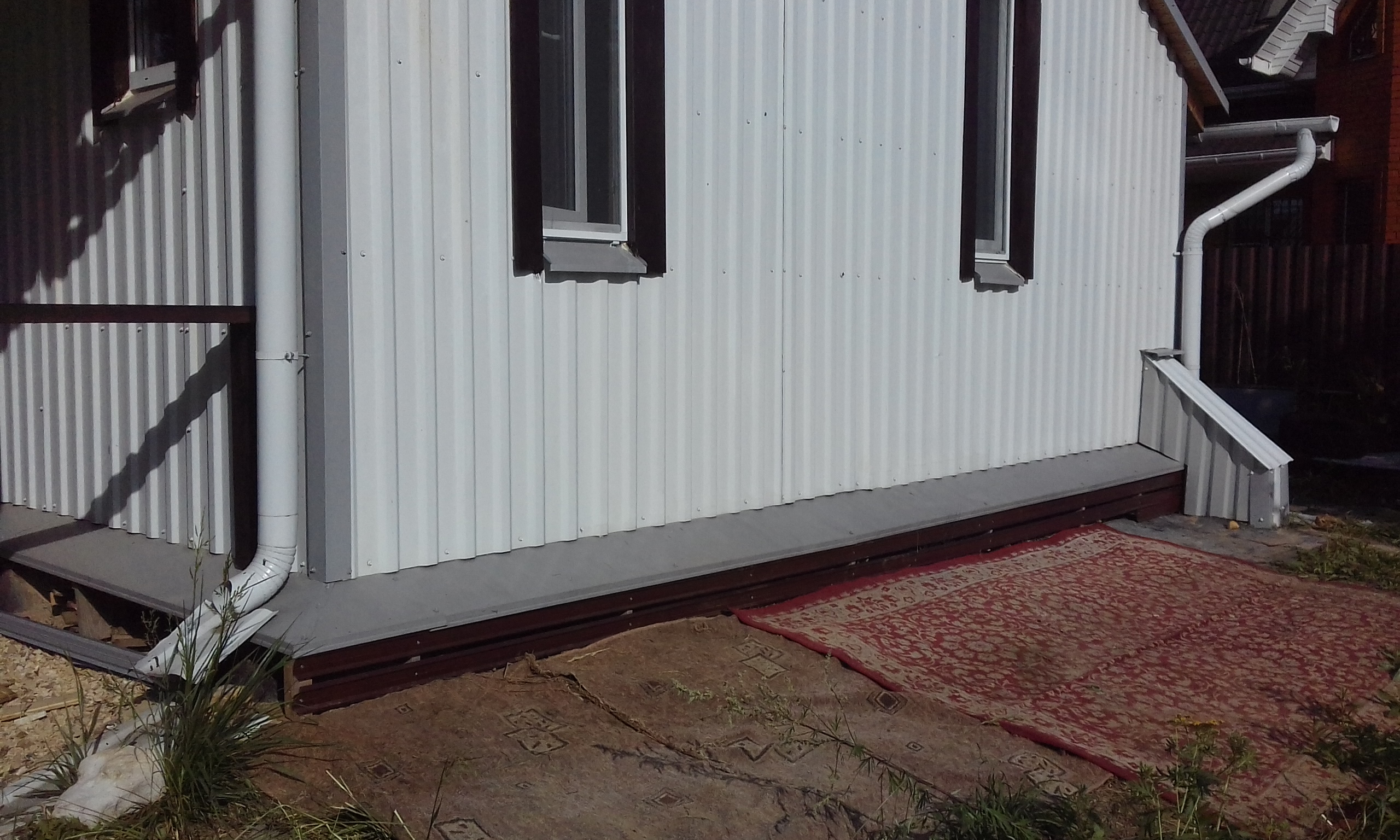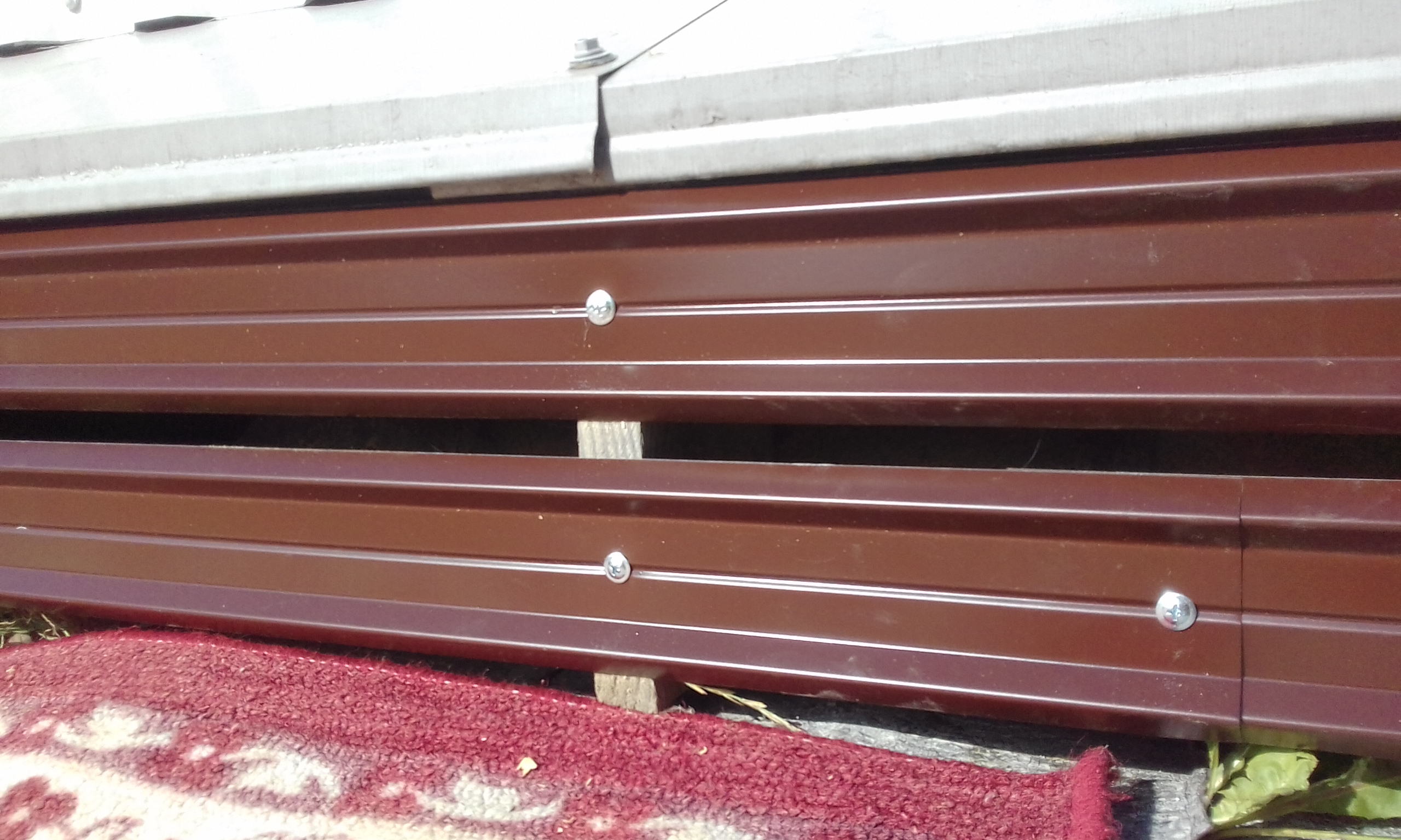 Экспериментально облицевал цоколь с торцовой части мет. штакетником 76х1800 мм по 86 руб. за штуку. Между штакетником зазор в 15 мм для вентиляции подполья.