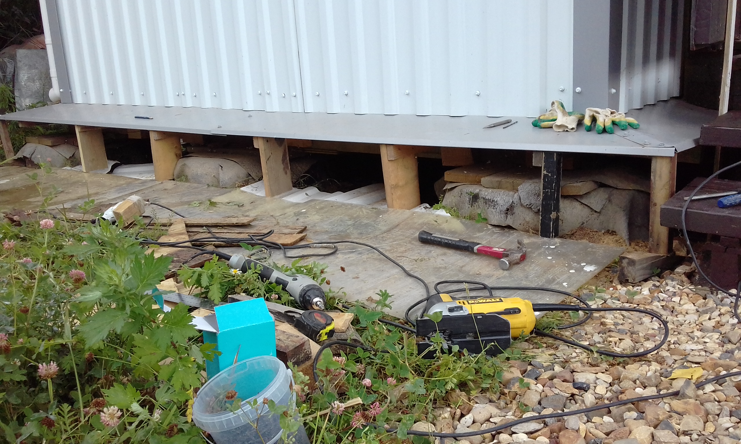 Генадич, я решил в навесе обойтись без покрышек. Т.к. они съедают и без того небольшую площадь (чуть больше 6 кв.м). Генадич, ты пропустил пост № 1019 viewtopic.php?p=45901#p45901 там на фото видно, что каркас навеса я закрепил с землёй с помощью четырёх 2-х метровых труб, забитых в землю на 1 м здоровенной кувалдой (ей как копром я уголки заземления погружал).
