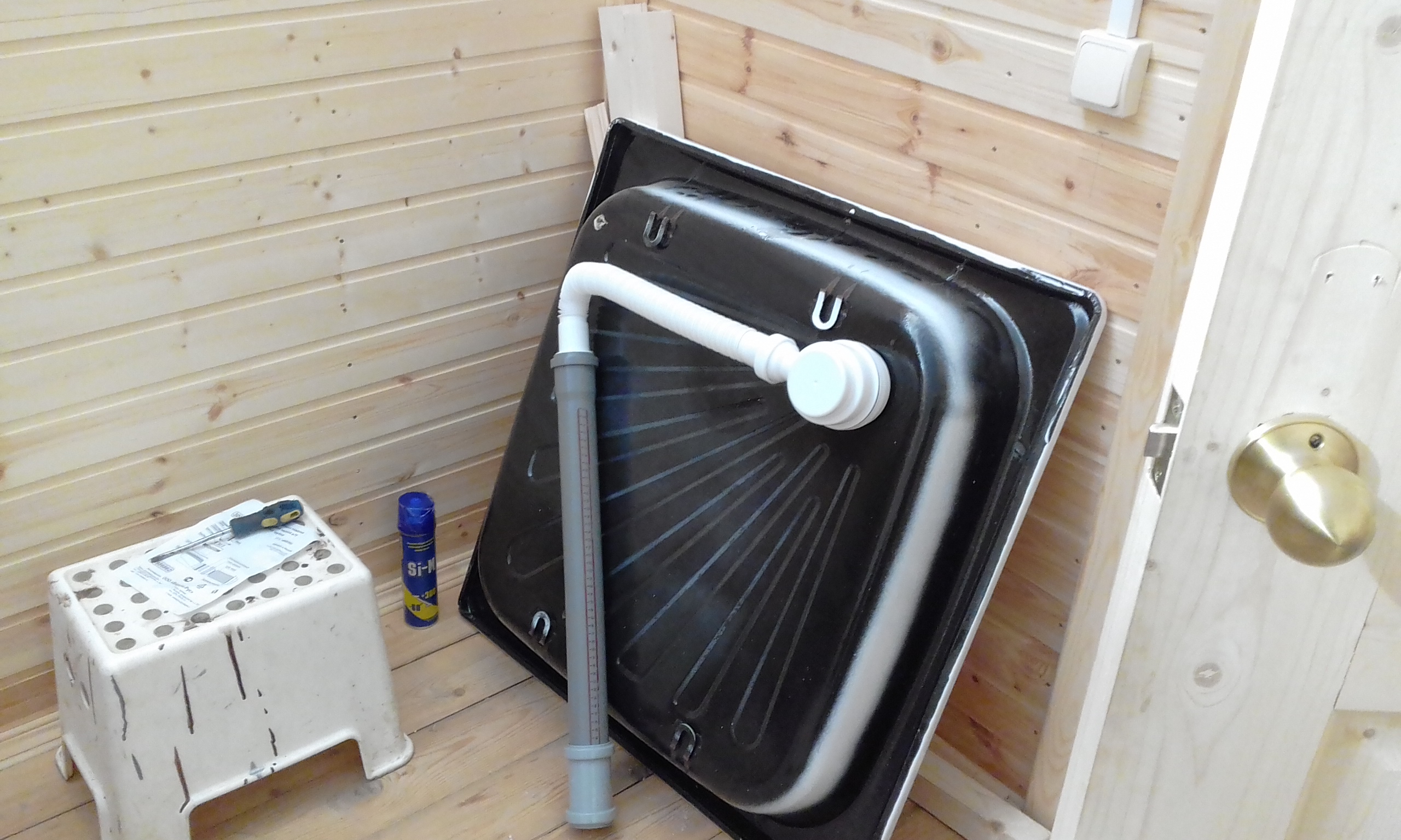 К душевому поддону прикрутил сифон. Предварительно в сифоне вырезал перегородки, чтобы не разбирать сифон в случае засора. 20180823_090809.jpgПровёл испытания системы методом пролива. Подкрутил неплотности в местах протечек. Получилось ОК.20180823_101106.jpgВ туалетной комнате прикрепил к полу два бруска 100х100 мм. На них установил душевой поддон для вёдер с торфом.20180823_123431.jpg