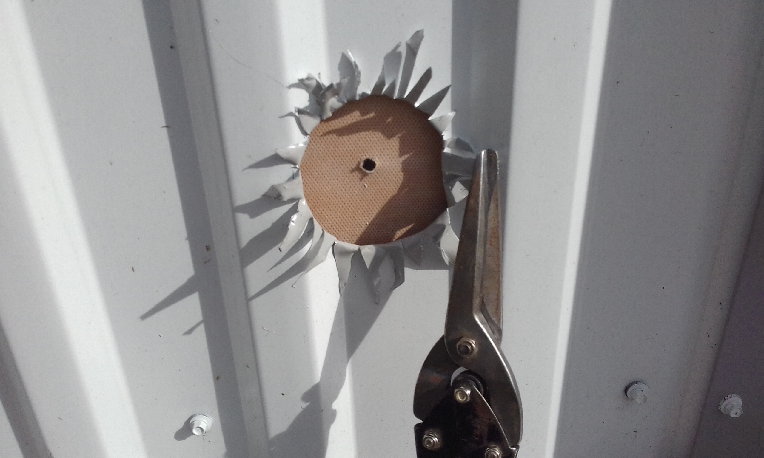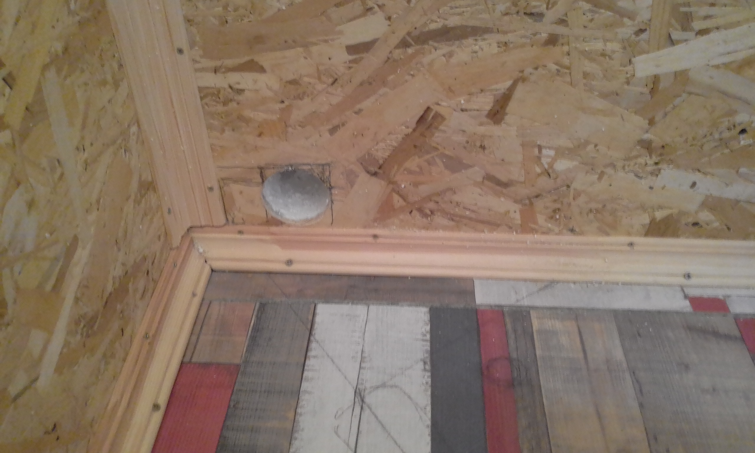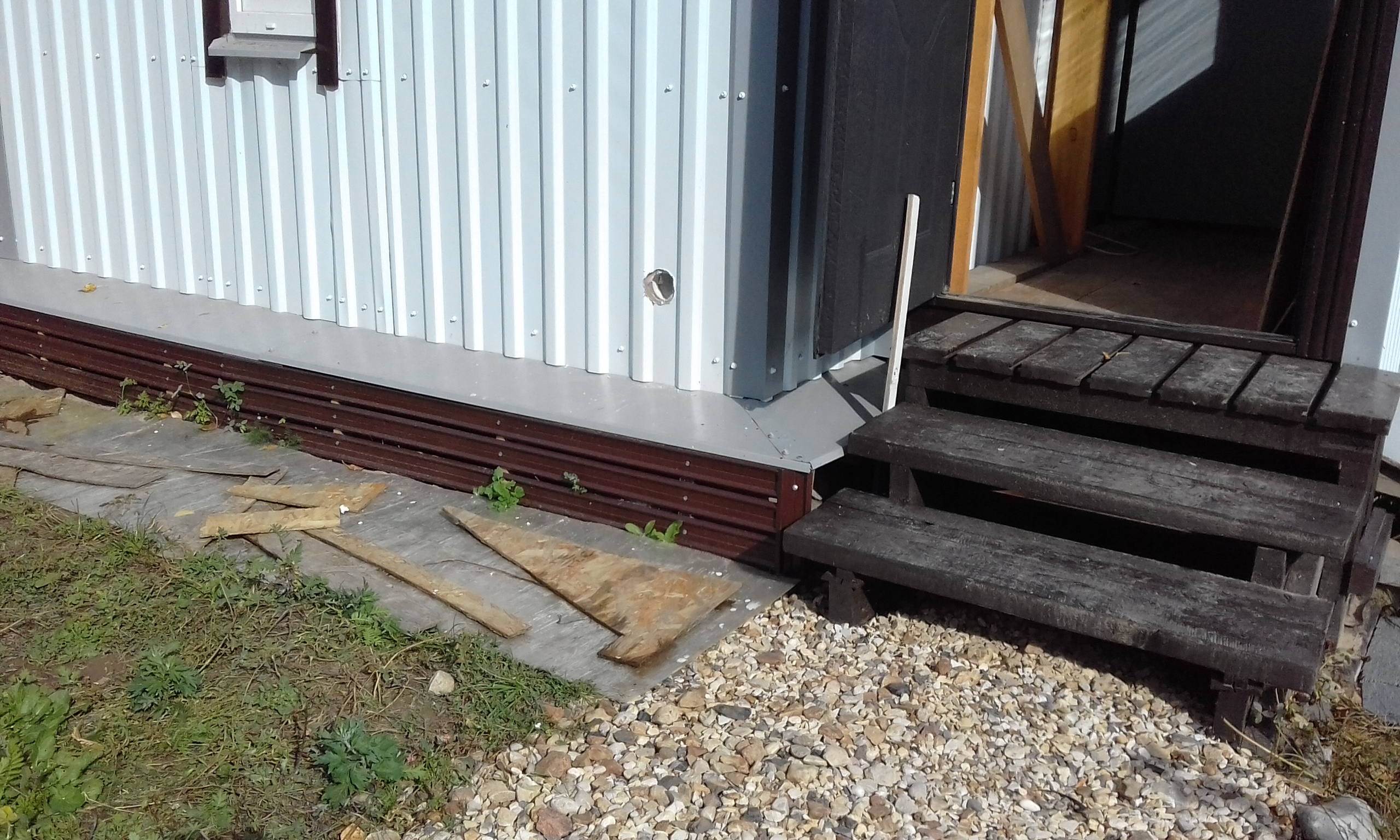 Просверлил отверстие в стене. Через пол выпуск не получается, т. к. под выпуском расположена покрышка фундамента, набитая песком. Прокопал начало траншеи и котлован под колодец. Магистральную линию канализации от умывальника к душу демонтирую.