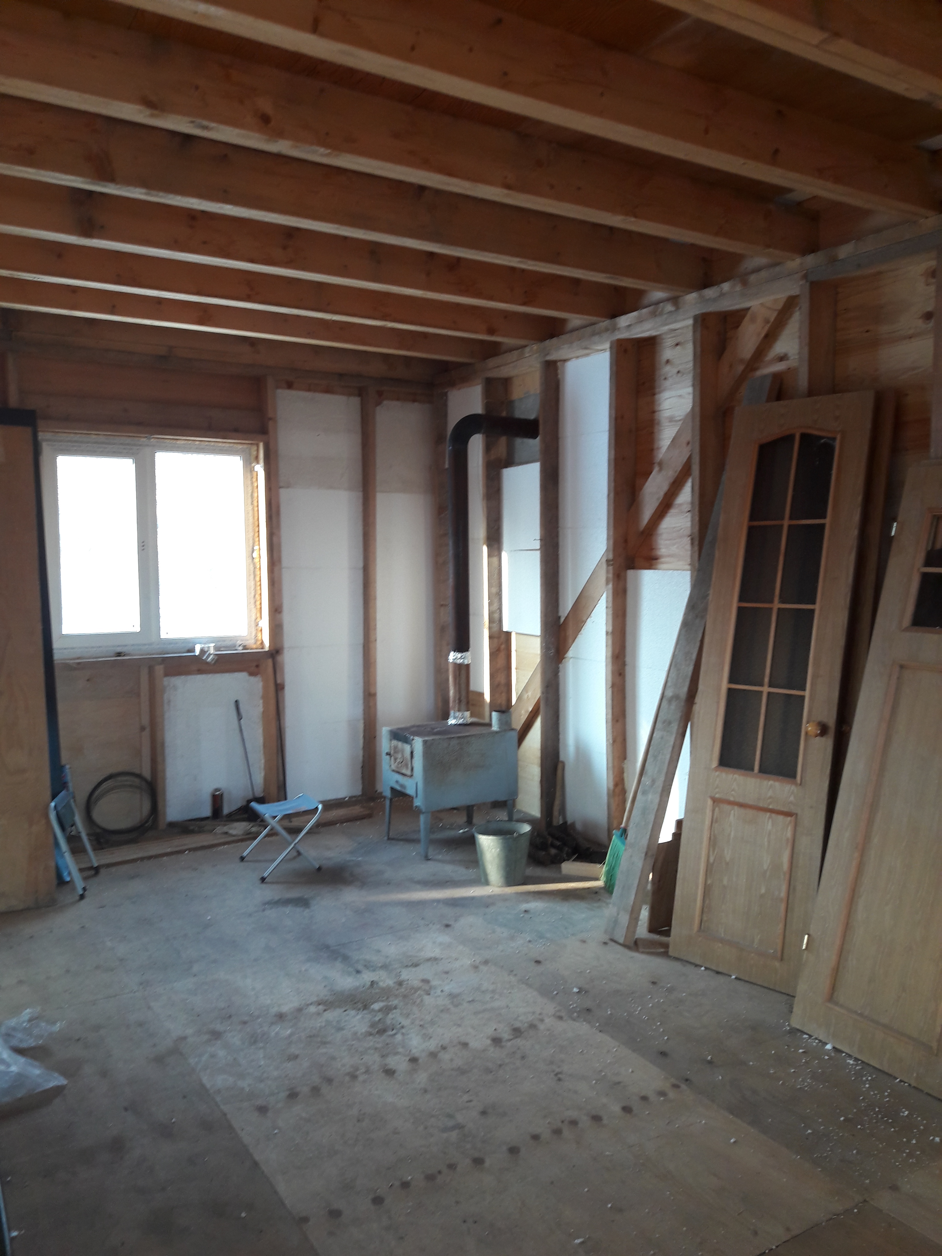 И вот что вышло Ну и дальше. Переделал свой резак для пенопласта. Сделал некое подобие станка. Упираешь лист пенопласта в прикрученную струбцинами палку, и опускаешь это дело вниз на горячую струну. Вжик и отрезано в размер. Лист нарезается очень быстро, а самое главное стоишь ровно, спину не крючишь. Ну и начал запихивать пенопласт в стены Вот и все. Холодно было, работа чето не спорилась... Не много сделал.