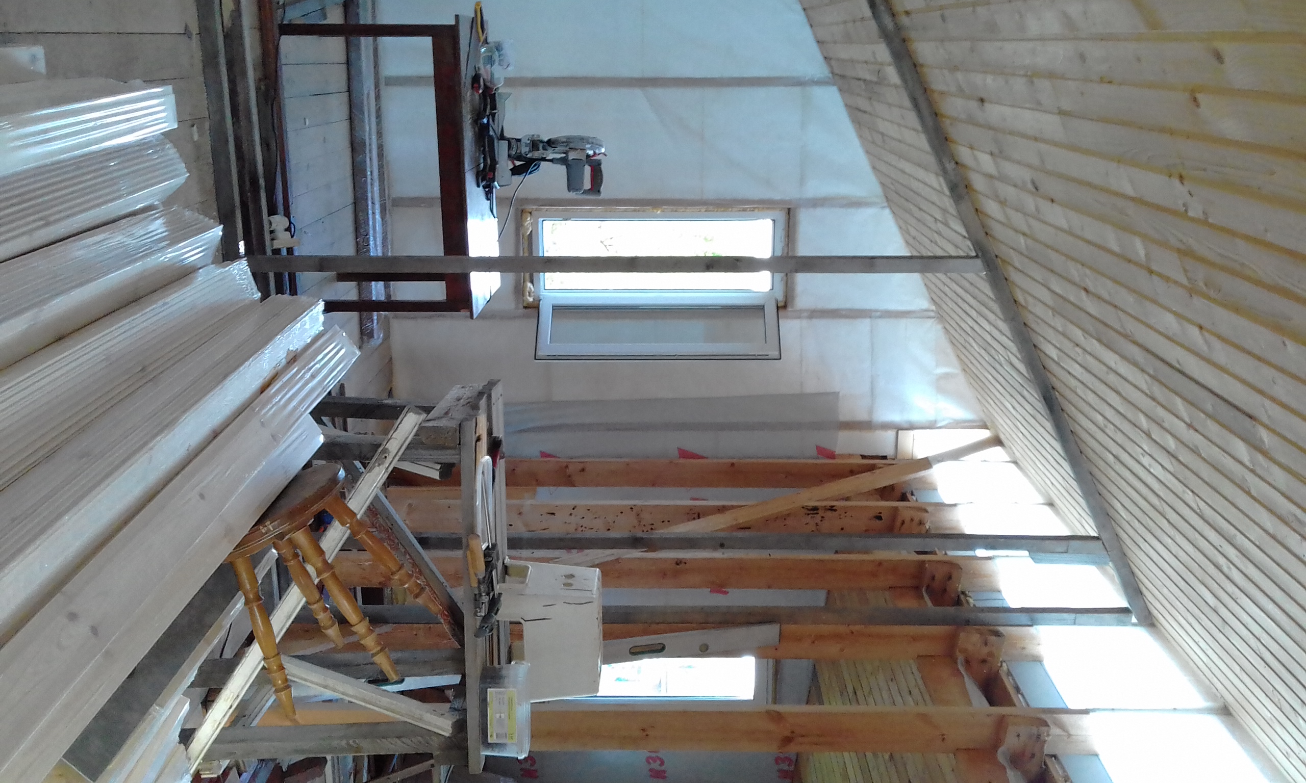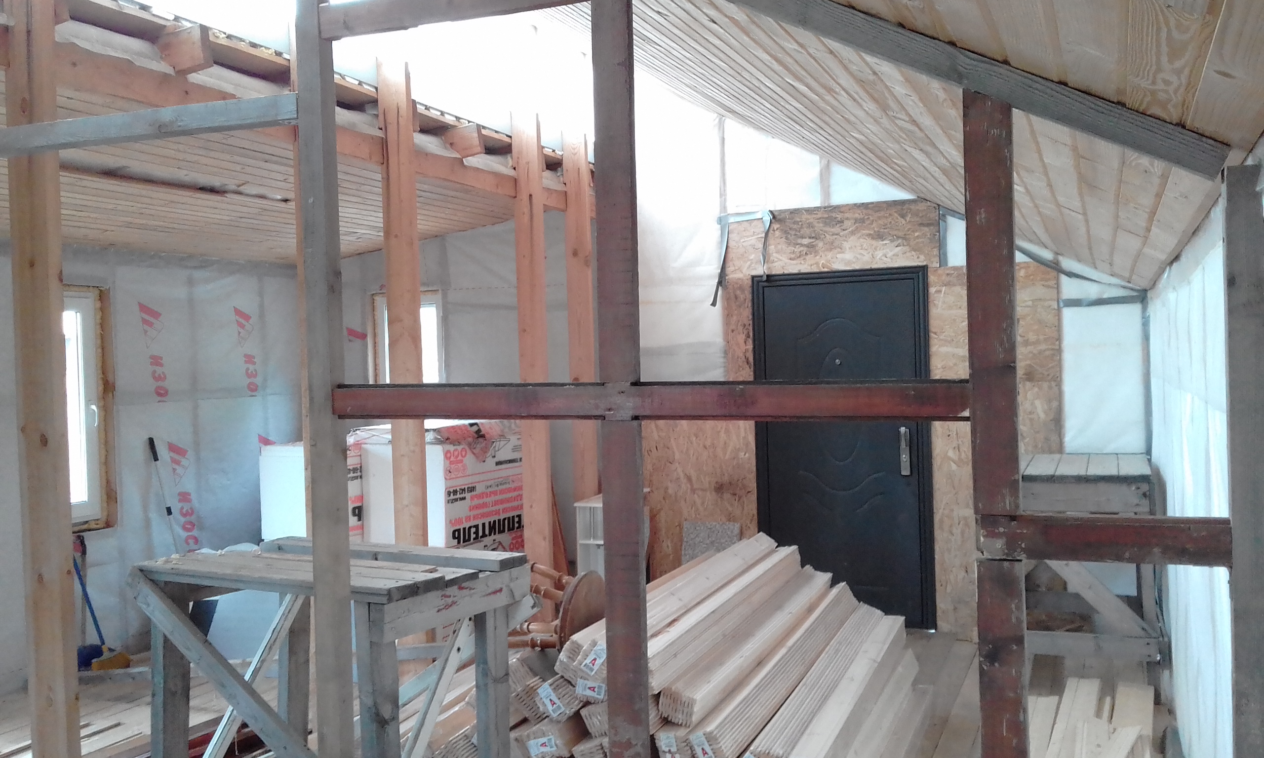 Выполнил каркас перегородки. Бруски, подобранные на помойке, хорошо смотрятся, даже жалко зашивать их.
