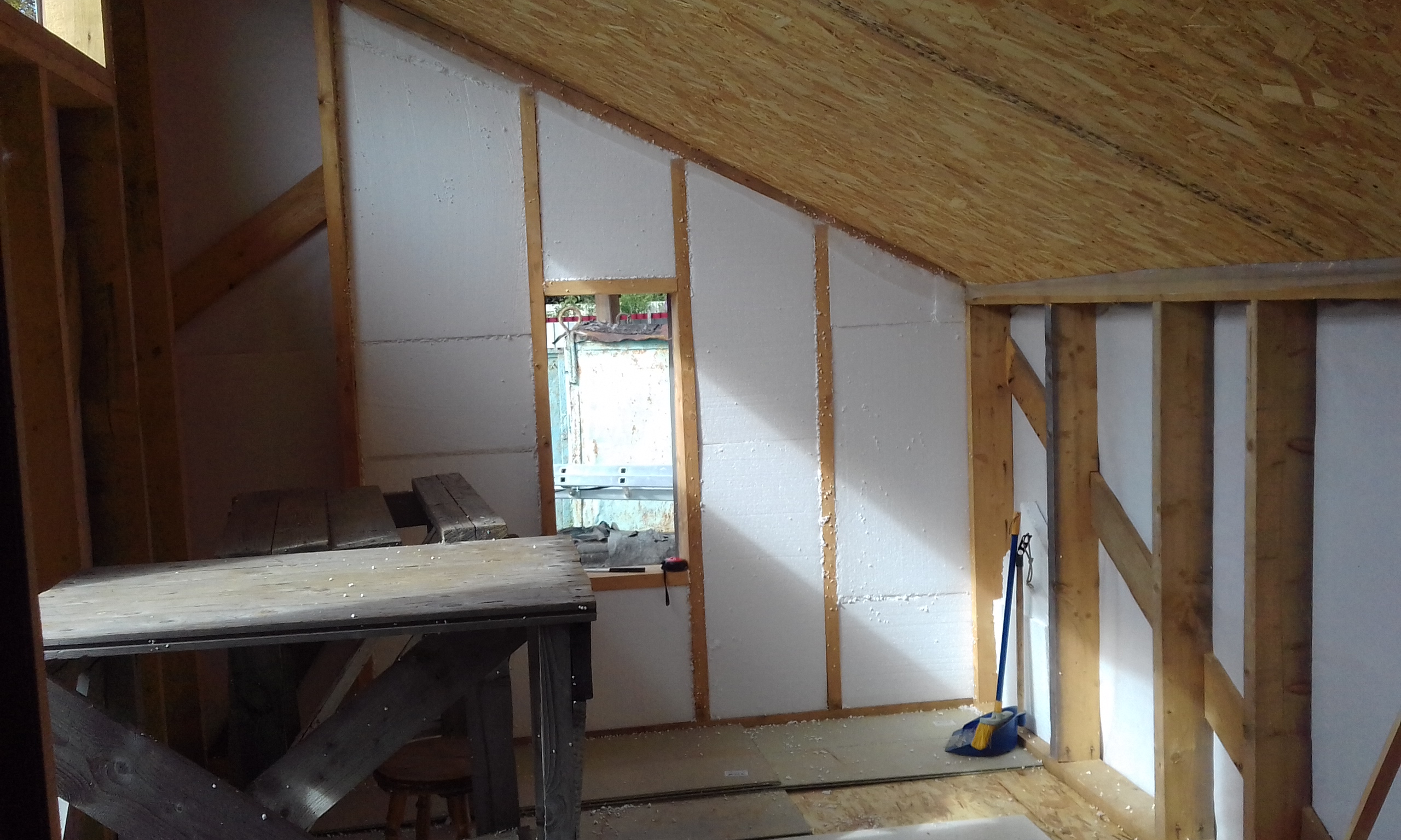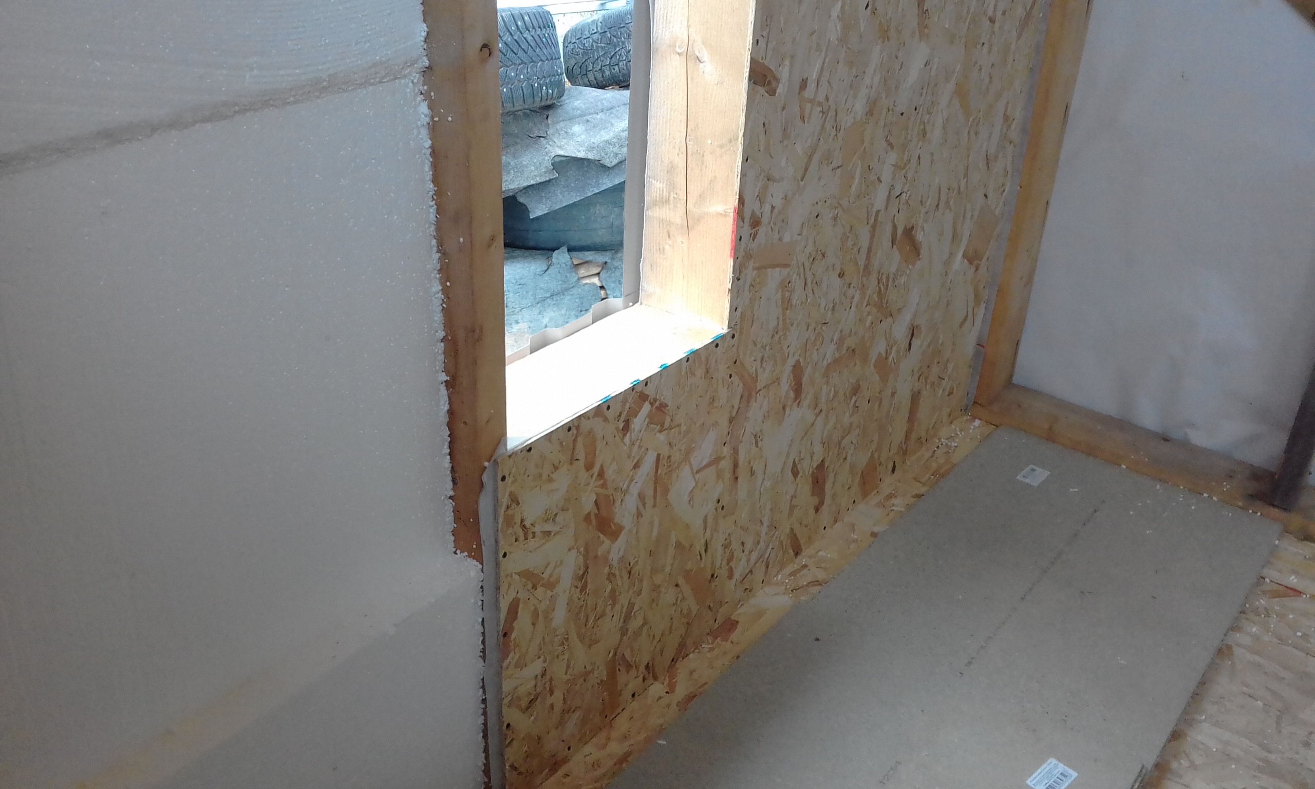 Приступил к внутренней обшивке наружных стен.