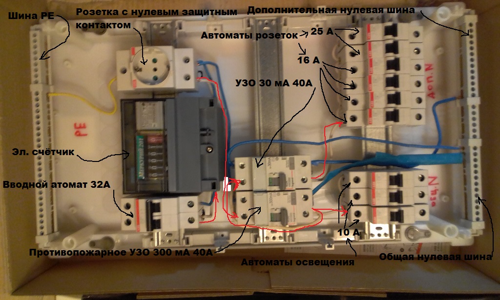 Коллеги, раньше мне не приходилось собирать вводные щитки. Вот сподобился. Может будут комментарии? Т. к. вводной автомат 32А, то УЗО взял на 40А, чтобы автомат защитил УЗО (выключил сеть до сгорания УЗО).
