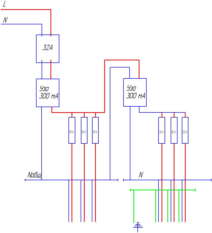 Нули после узо не подключаются к общему вводному нулю. У тебя к вводному нулю должен подключаться только вводной автомат, а к нему подключатеся пожарное узо. И на этом общий нуль заканчивается. Есть нуль который идет от общего узо. И нуль от узо на 30 мА.