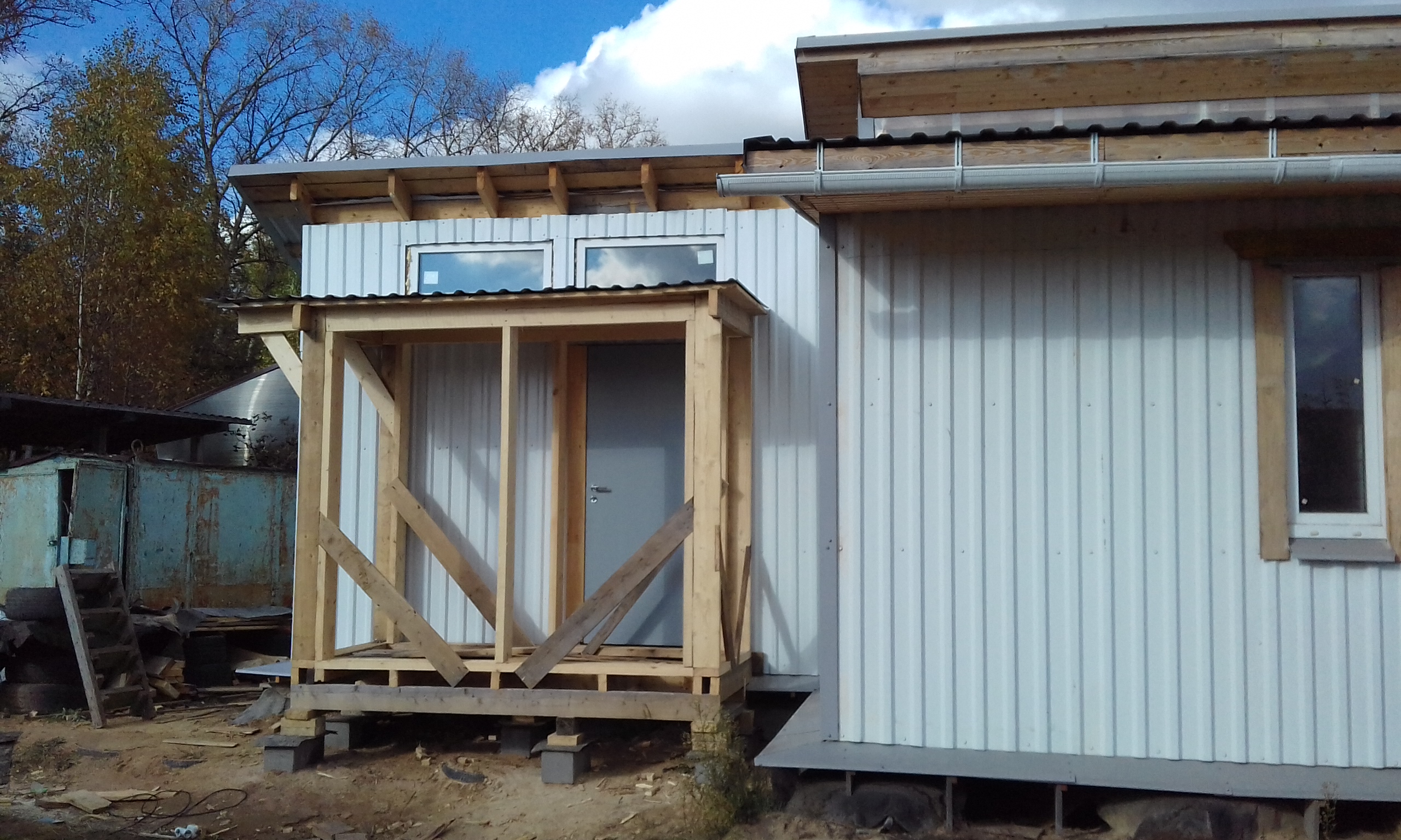 Давно я ждал погожий денёк. И вот он случился. Поспешил настелить кровлю тамбура из профлиста толщиной 0,5 мм по сплошной обрешётке из дюймовки + контробрешётка для проветривания.