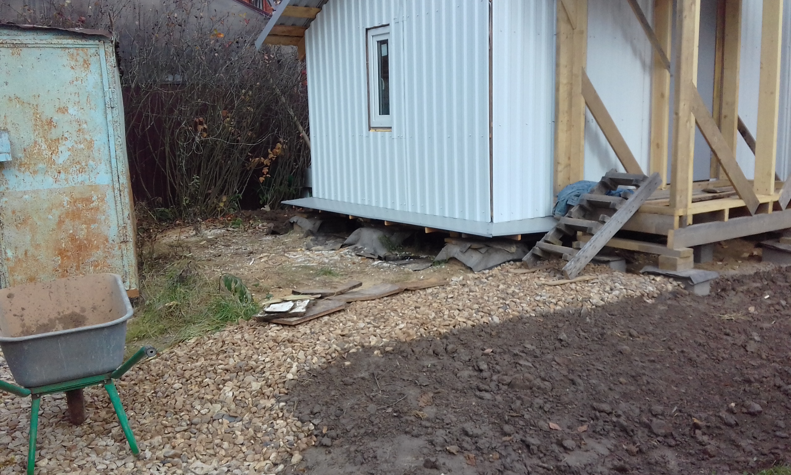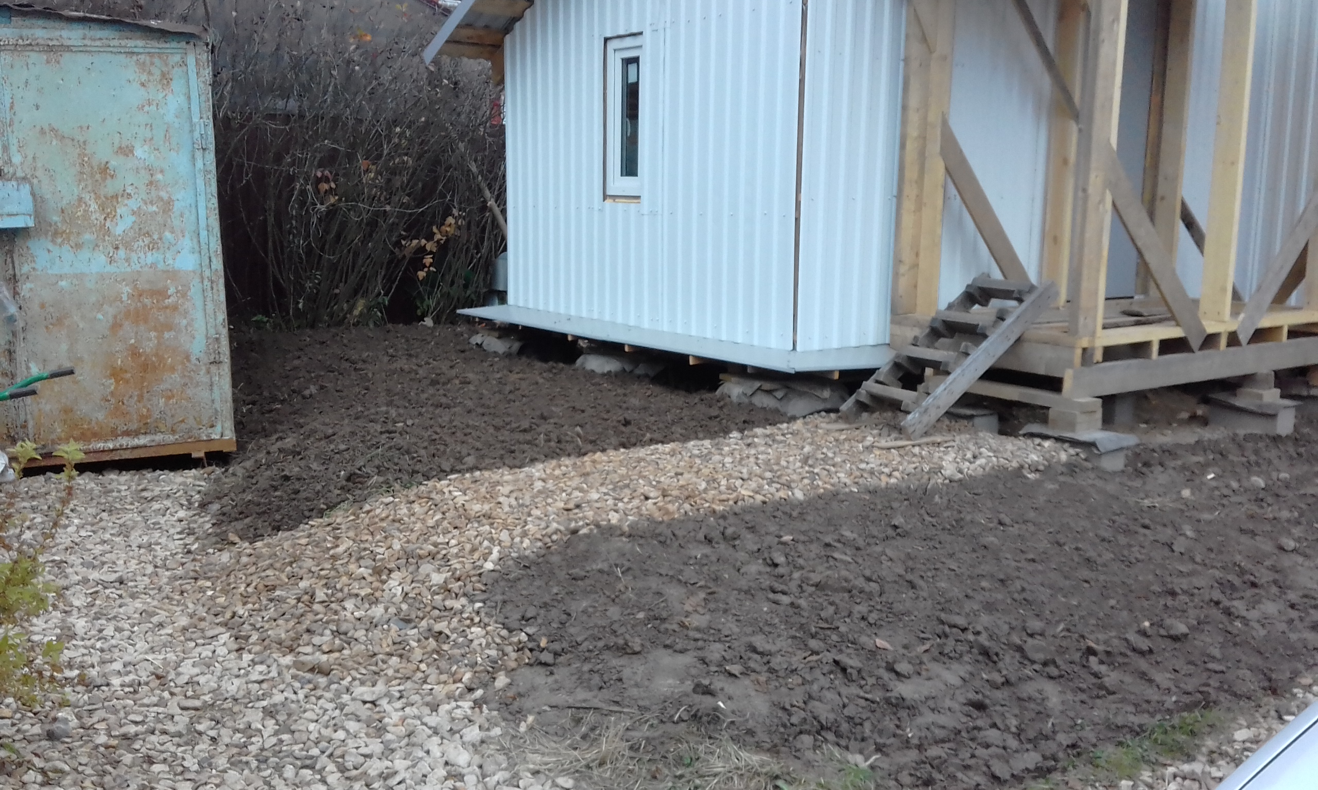 Выполнил благоустройство части территории. Отсыпал растительный грунт. Благо стоит сухая погода.