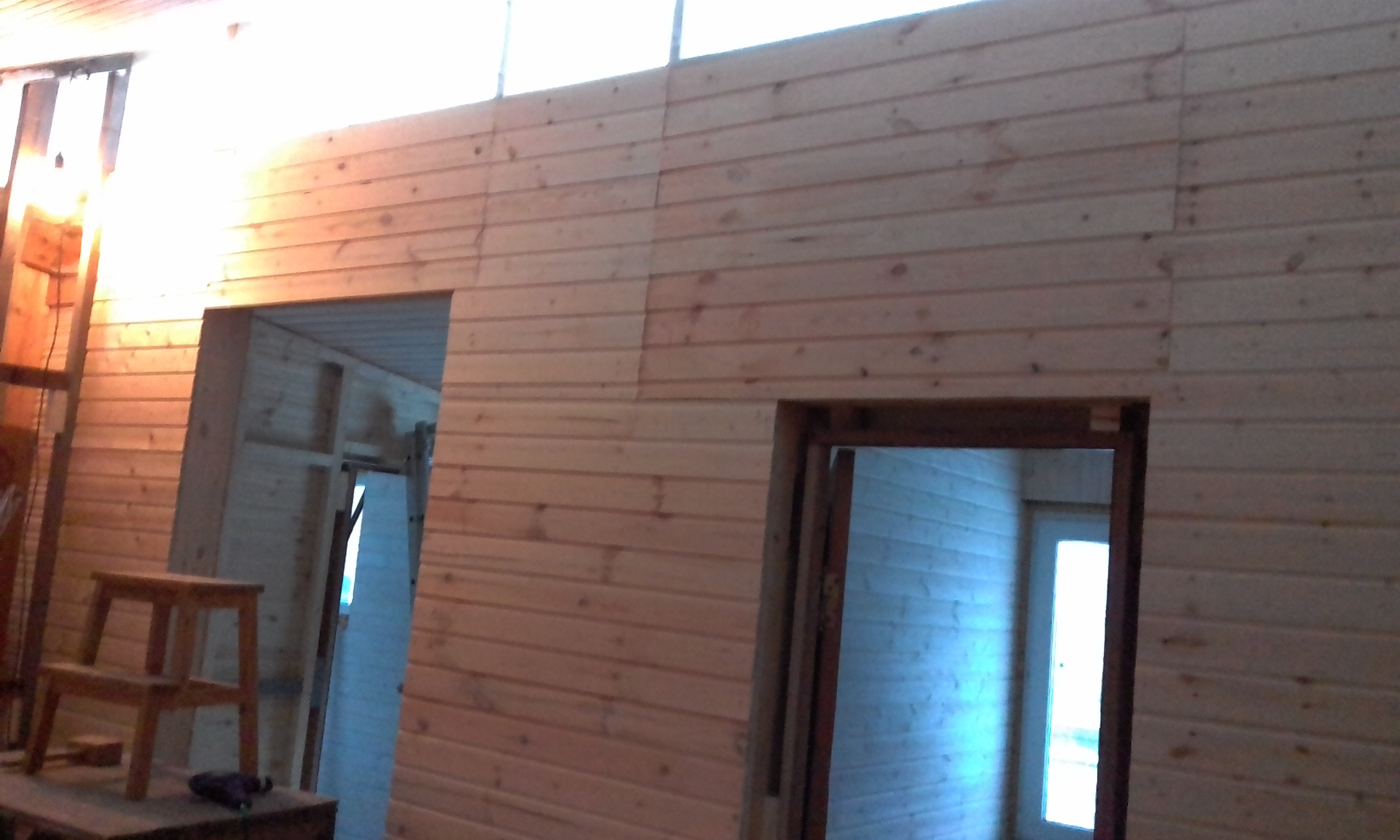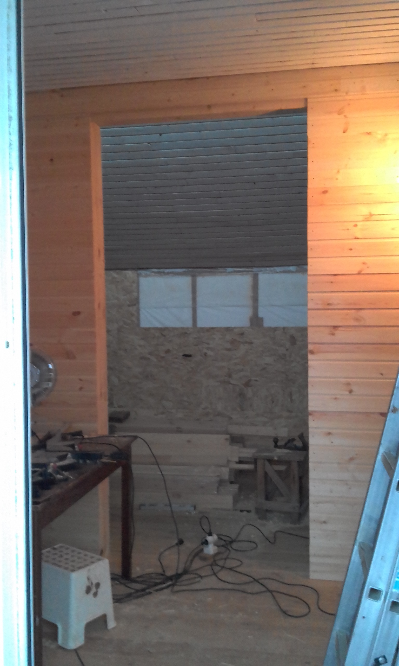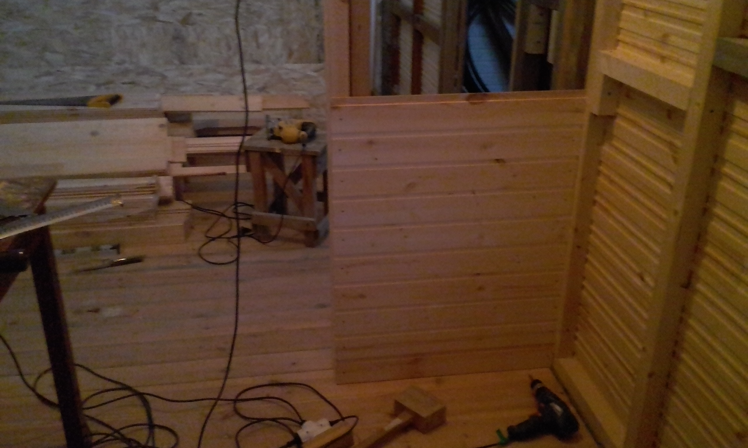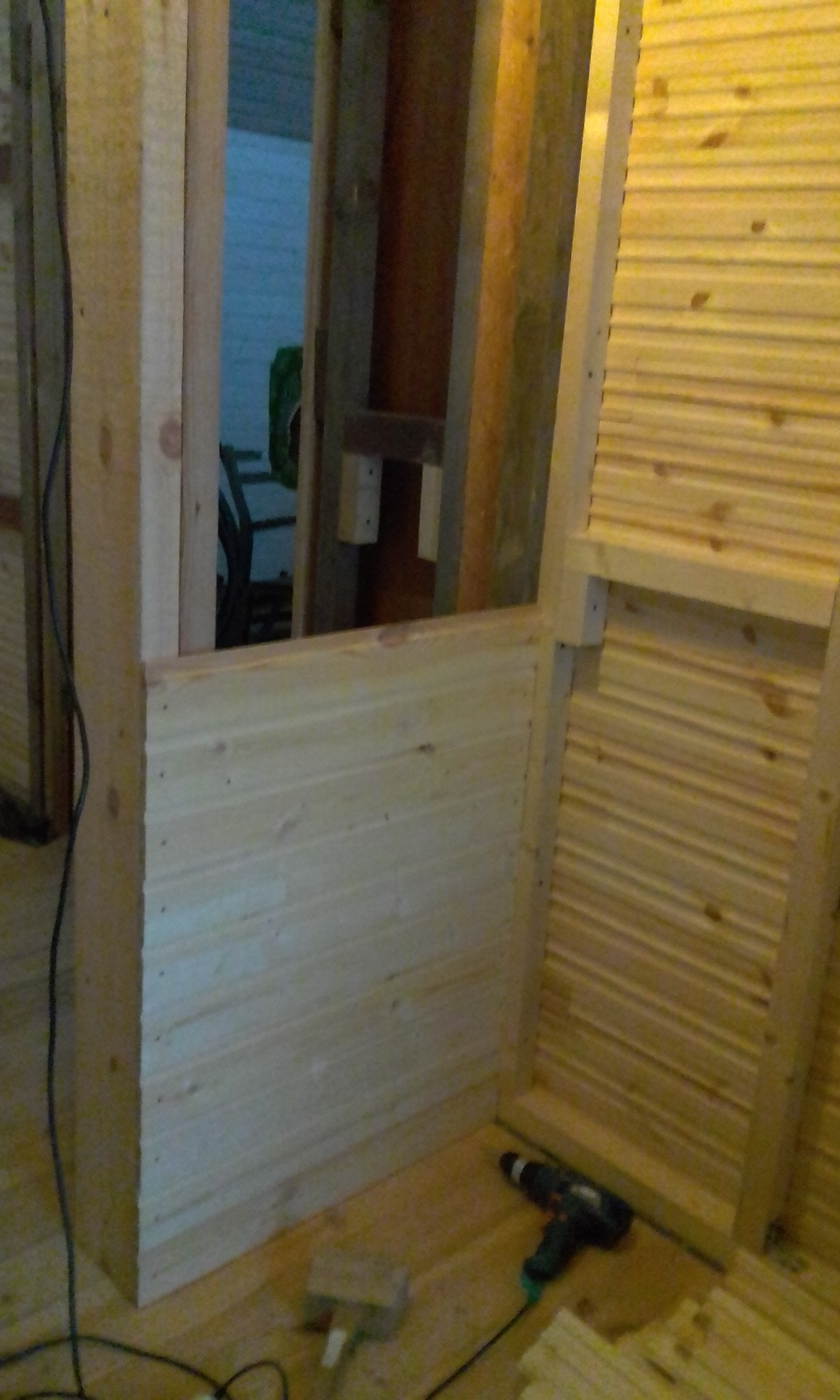Продолжаю обшивать центральную стену. Приступил к последнему не обшитому углу.