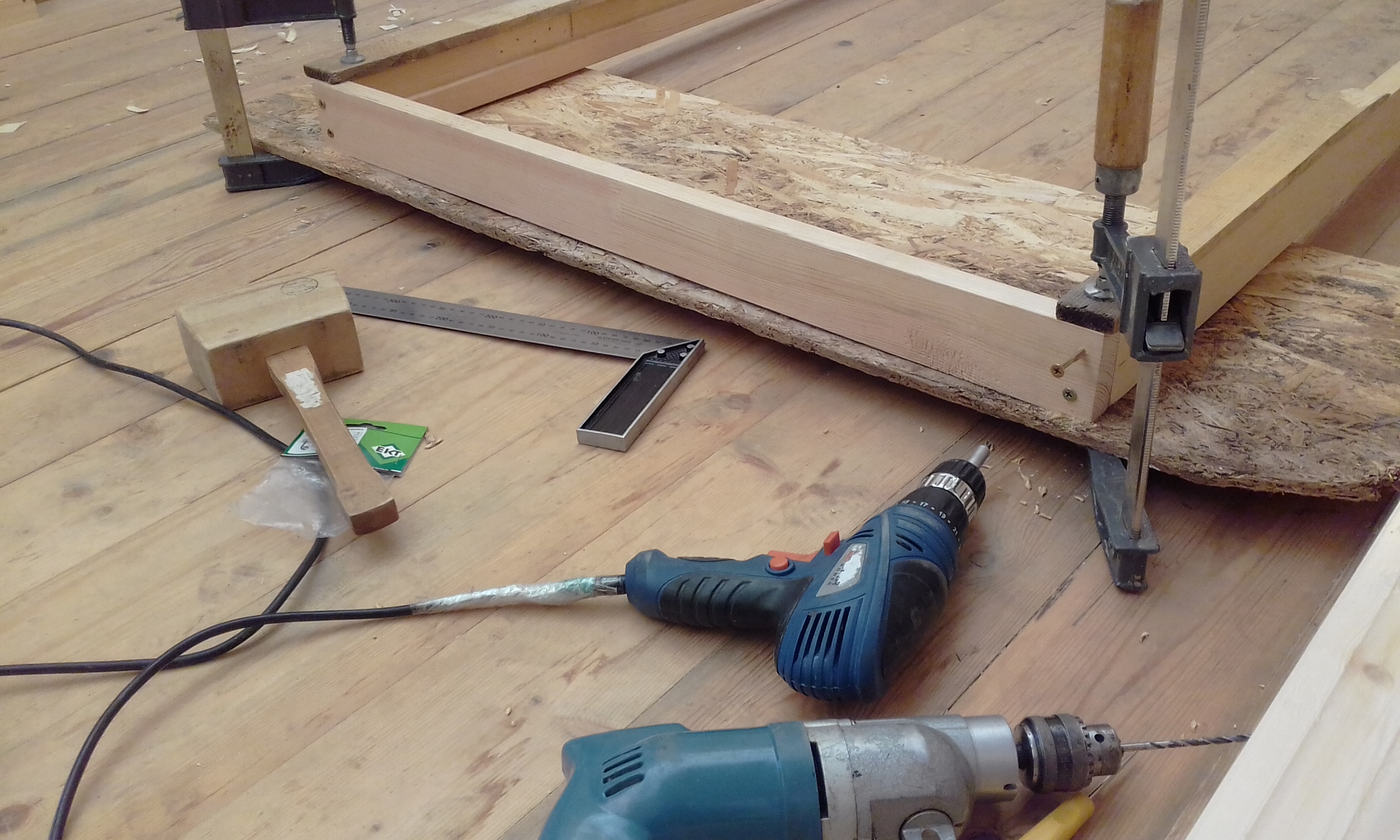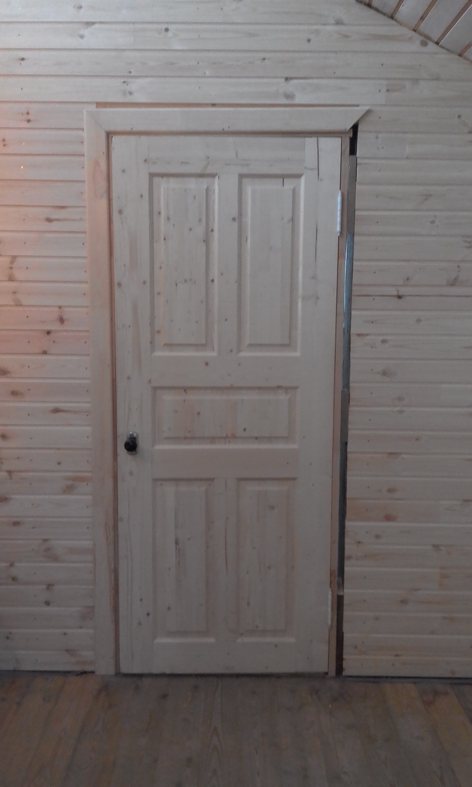 Навесил дверь. Пришлось повозиться подстругивать полотно, слишком плотно прижал к задней поверхности оробки, надо было на 2 мм вперёд выставить.