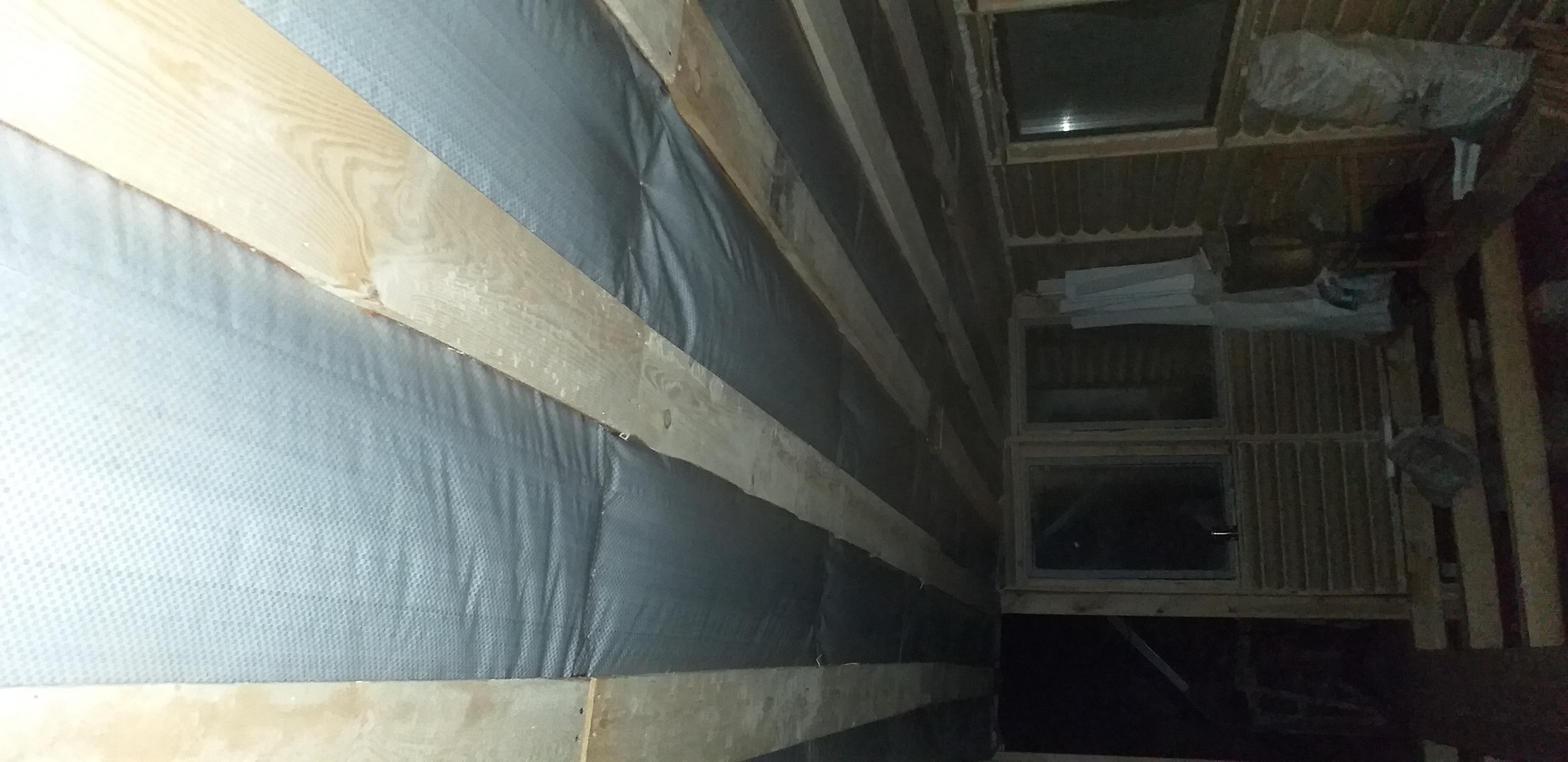 За всякими делами я забыла написать, что засыпали потолок. Крошка такая текучая, что ее не задували а просто засыпали в тихую безветренную погоду. Сняли железо, снизу натянули паро-гидро-ветро, засыпали крошку, она не трамбуется не фига, растекается просто.Насыпали побольше, затянули сверху гидро-ветро, проложили рейку и прикрутили железо. Так когда сверху ее прижали чуток - она снизу выпятилась. На фотках не стена , а потолок. И ночь.