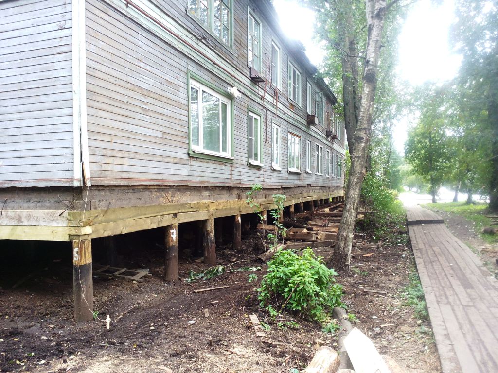 Висячие деревянные сваи, иетр от земли, зашивается фартуком из дюймовки и так и эксплуатируется. Дом 1958 г. в Архангельске