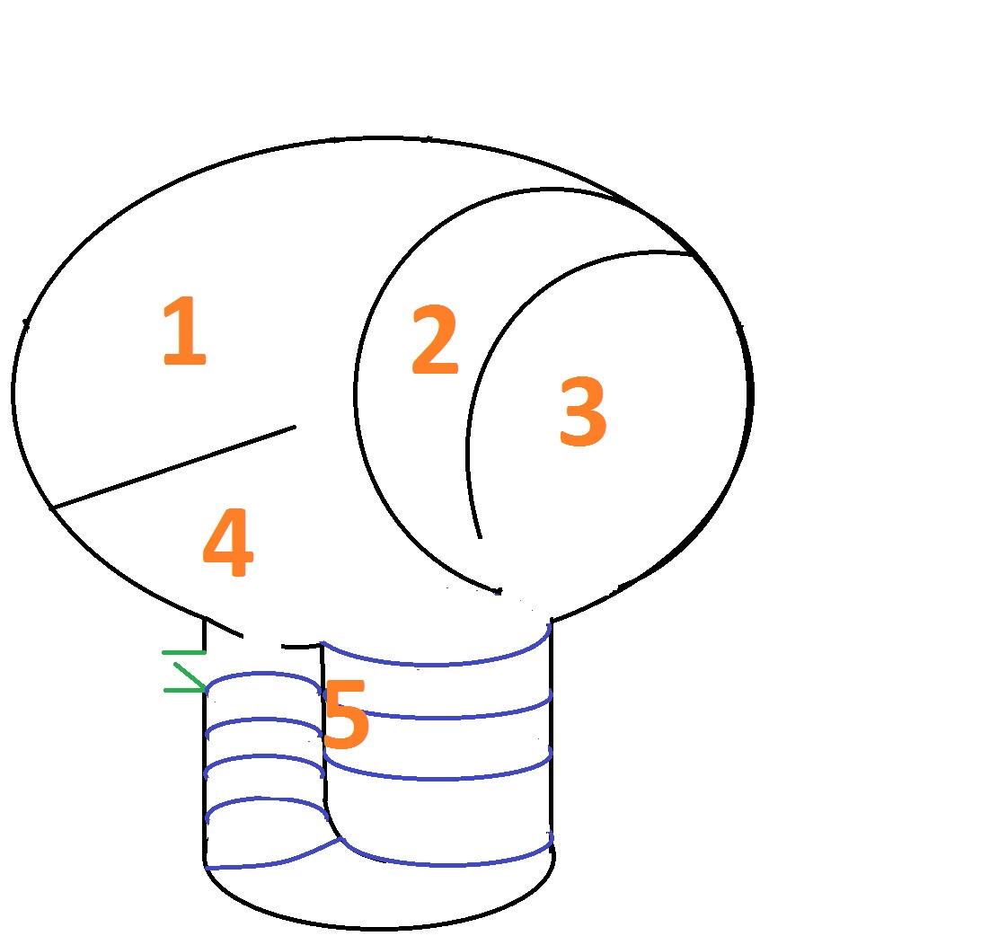 Это план первого этажа. Черным цветом обозначены несущие стены, оранжевым цветом пронумерованы помещения, синим цветом - лестница, а зеленым - вход с улицы. Межкомнатных дверей не будет, так как проходы расположены так, чтобы увидеть что происходит в соседней комнате, надо стоять непосредственно перед самим проходом, в метре от него. 1) Спальня, 2) Туалет-ванная, 3) Кухня, 4) Коридор-прихожая, 5) Эркер-лестница на второй этаж и спуск в подвал. На втором этаже: помещения 2 и 3 совмещены в одну круглую комнату, а помещения 5 в жилую комнату. На втором этаже помещения 2,3 и 5 будут иметь общий проход. Предполагалось, что когда входишь с главного входа (зеленый), то повернув сразу направо, можно спуститься в подвал. А на второй этаж можно подняться из помещения 4 (из главного входа налево, потом направо и еще раз направо). Масштаб овала 10х5(6) метров, эркер примерно 3х3,5 метра.