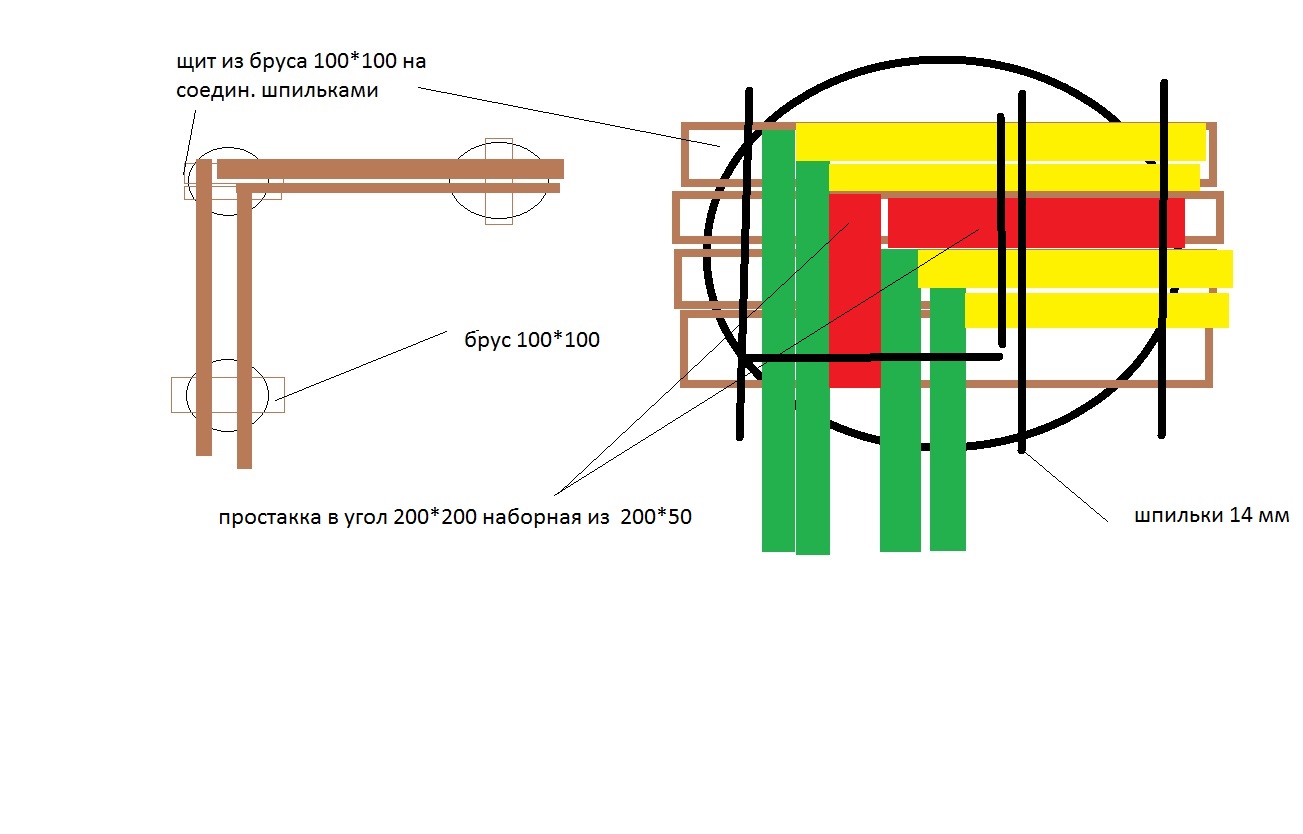 Щит в угол из бруса 100*100 размером 500*500 соединен тремя шпильками.