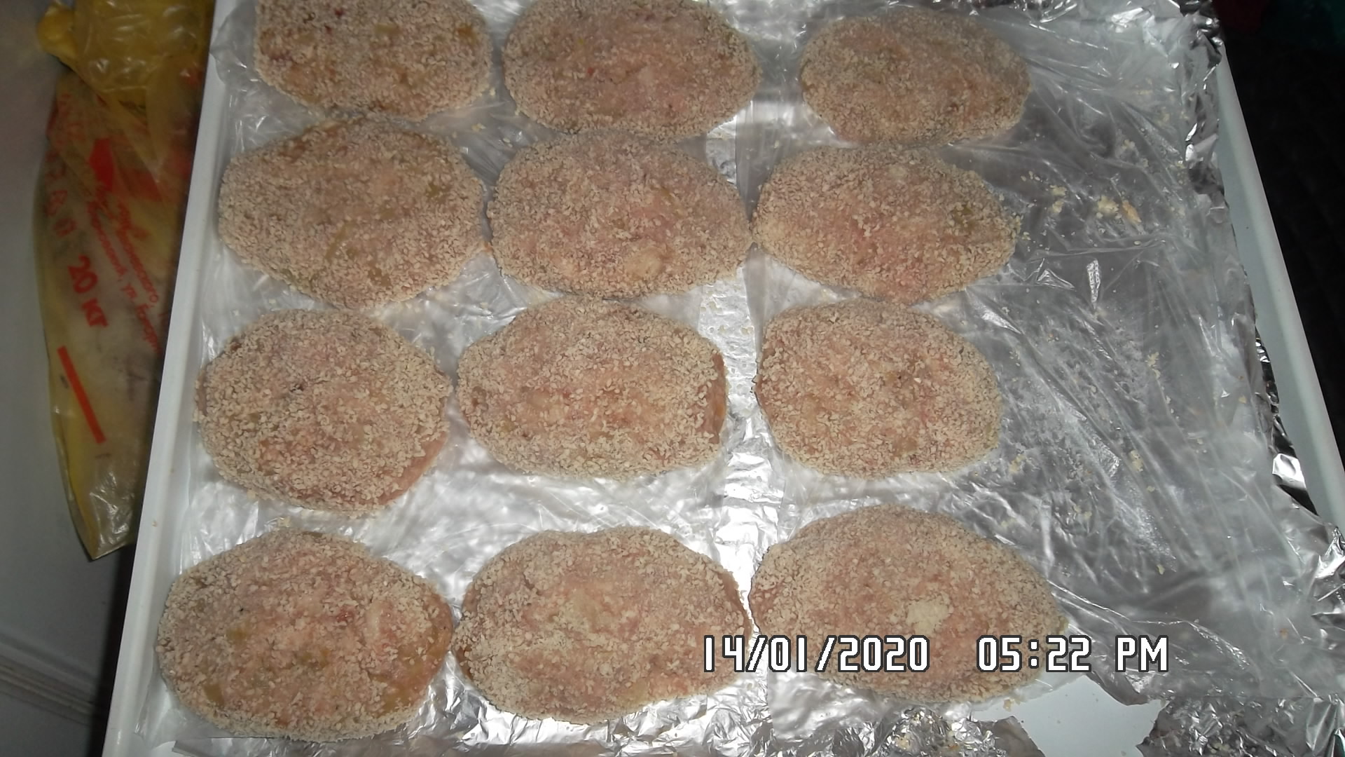 сделала котлетки..На кило фарша -300гр отжатого батона, три луковицы 200 гр в жареном виде и две ст.ложки без верха крахмала, чайная ложка перца и на мясо 20 гр соли. Лук солила отдельно, чеснок не чувствуется вообще, хотя он там есть. Потом пришлось слить в фарш остатки молока, а то был немного суховат. Первый раз делала без яиц и не пожалела.Фарш был готовый , из нашего поросенка. Очень хорошо вымесила и отбила готовый фарш.получилось 1620 гр. Котлеты люблю большие, не меньше 100гр, поэтому получилось 16штук. Внутрь каждой положила по кусочку сливочного масла примерно на треть чайной ложки. Панировала в панировочных сухарях.