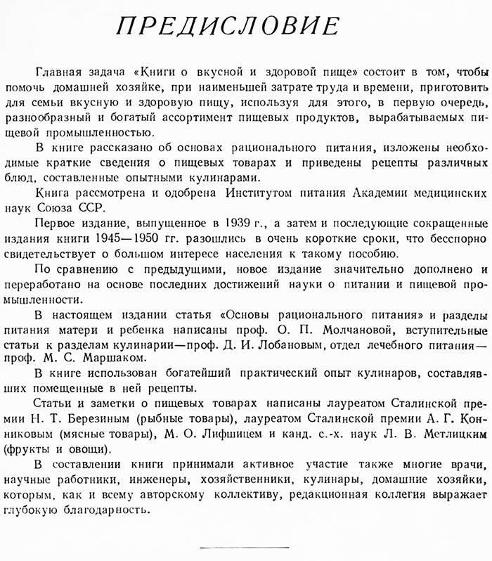 Научное предисловие книги написано академиком А. И. Опариным, статья "Основы рационального питания", разделы о питании матери и ребенка – проф. О. П. Молчановой, новая глава "Лечебное питание" - проф. М. Ш. Маршаком и кулинаром И. С. Лукасиком, статьи о пищевых продуктах – М. О. Лифшицем и доктором с.-х. наук Л. В. Метлицким.