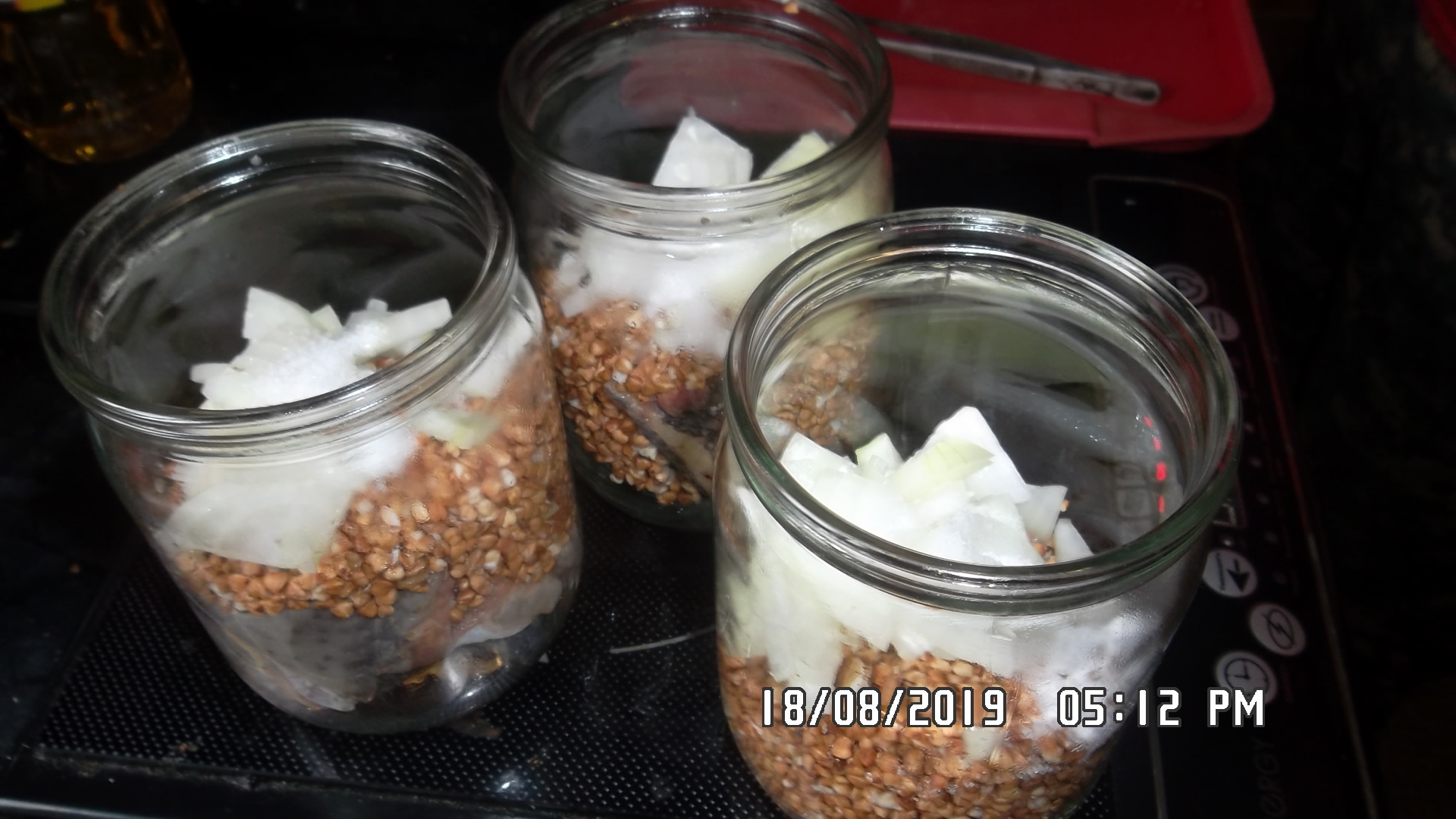 По паре кусков мяса и гречка с луком. Нужно бы еще морковку положить , но ее нет.