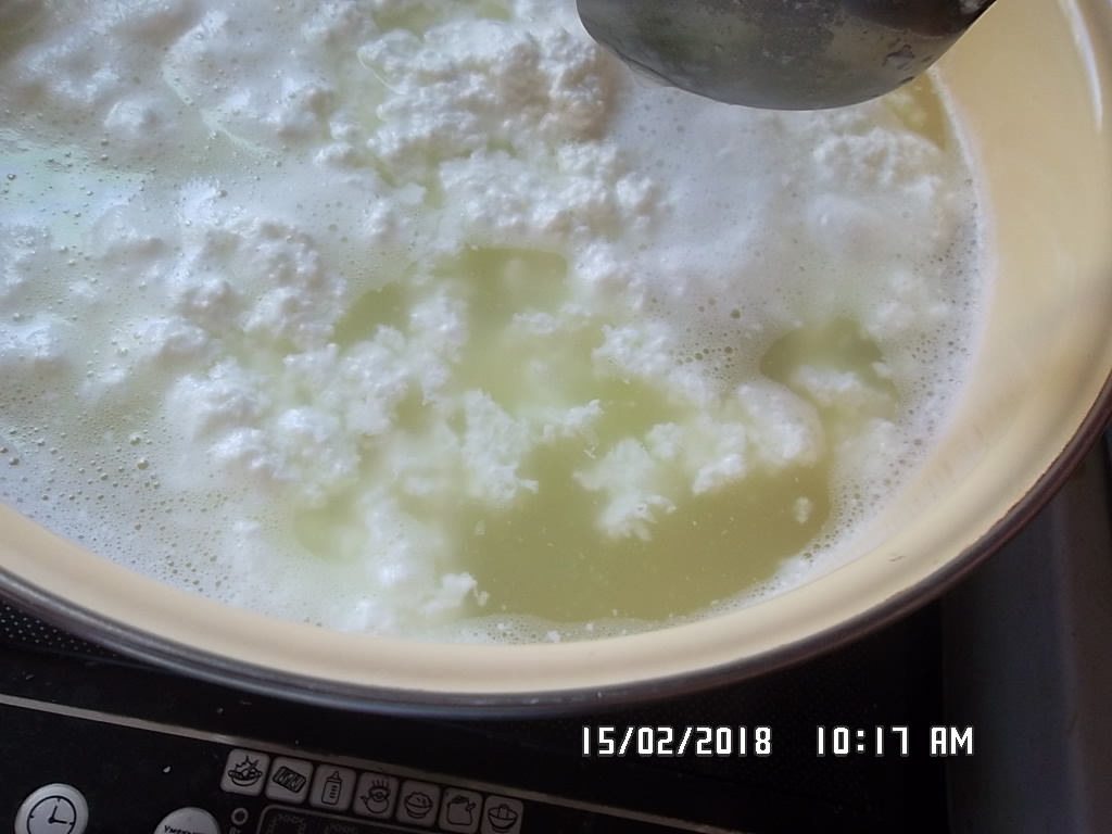 МолокоНагревает до 80 гр. На простой плите - почти до кипения. Здесь у меня около 4 л молока. Залила полную ложку уксусной эсенции. Сразу размешала.