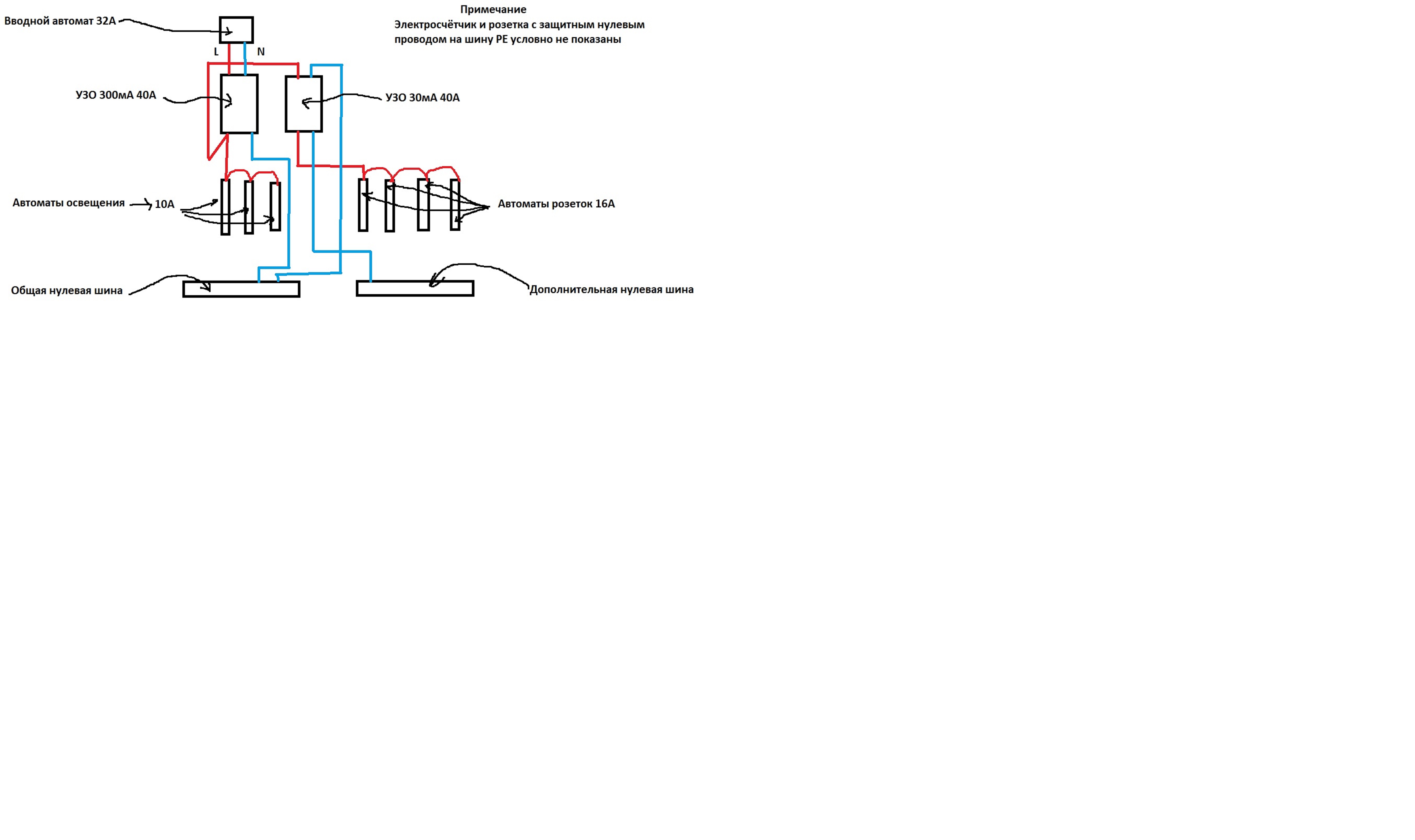 Коллеги, раньше мне не приходилось собирать вводные щитки. Вот сподобился. Может будут комментарии? Т. к. вводной автомат 32А, то УЗО взял на 40А, чтобы автомат защитил УЗО (выключил сеть до сгорания УЗО).