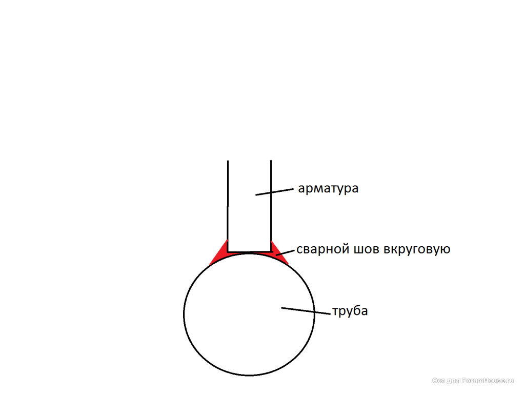 "Варите арматуру к трубе встык. Это будет надёжней. Пятно контакта будет больше."