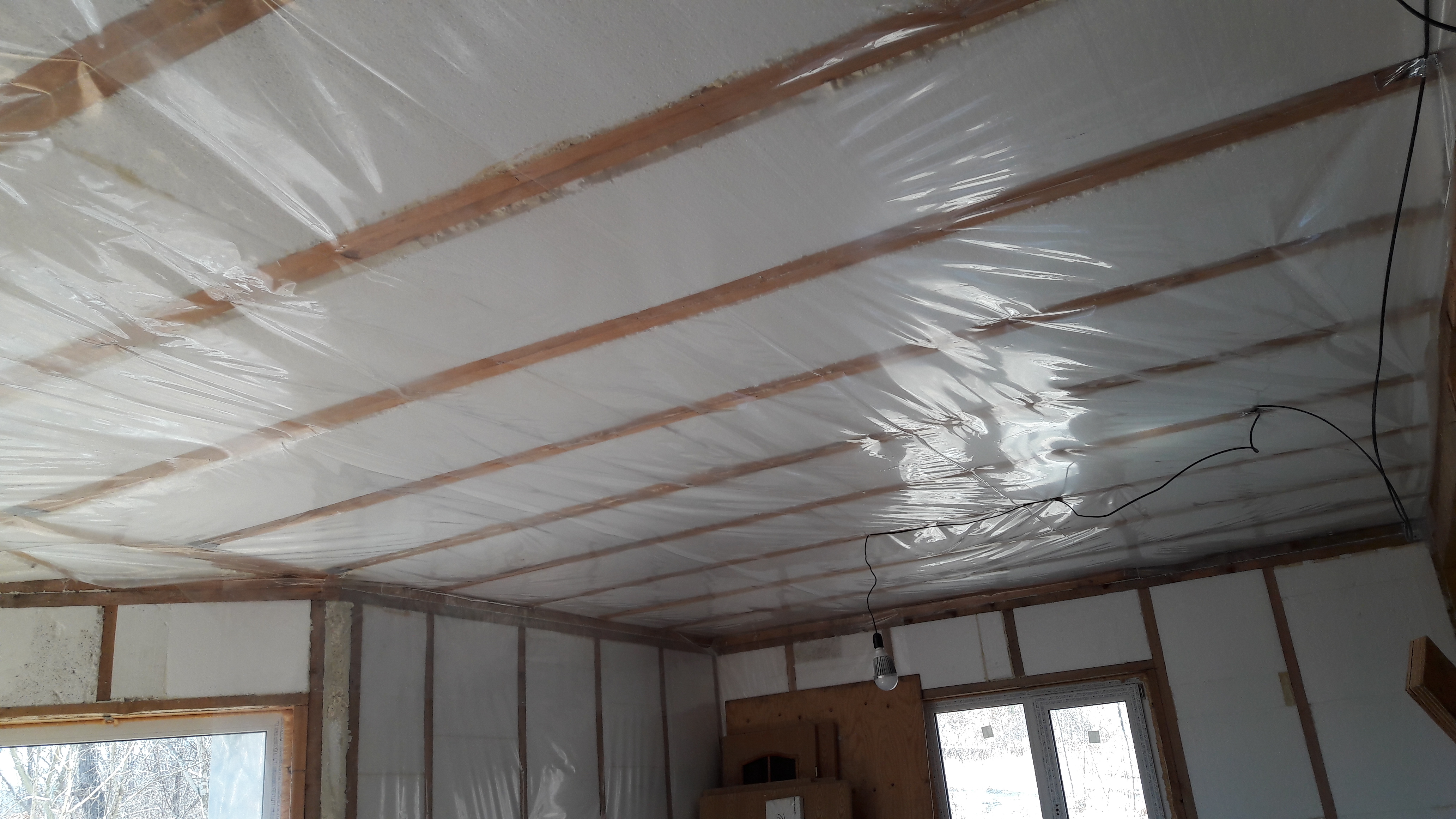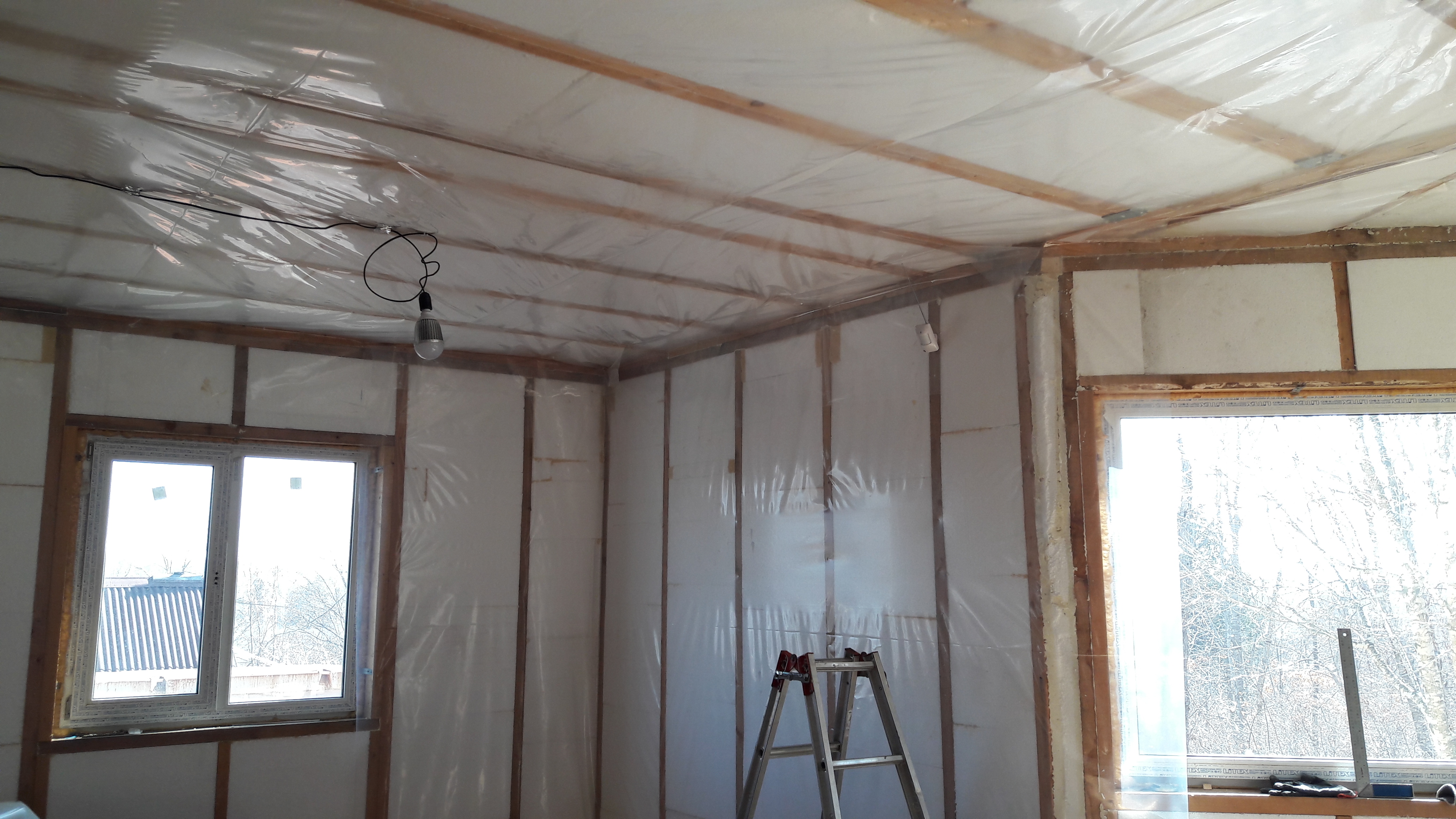 И начали натягивать пленку. Натянули потолки. Самое сложное, однако. И затянули большие куски стен. Вобщем то что в одного делать крайне неудобно.