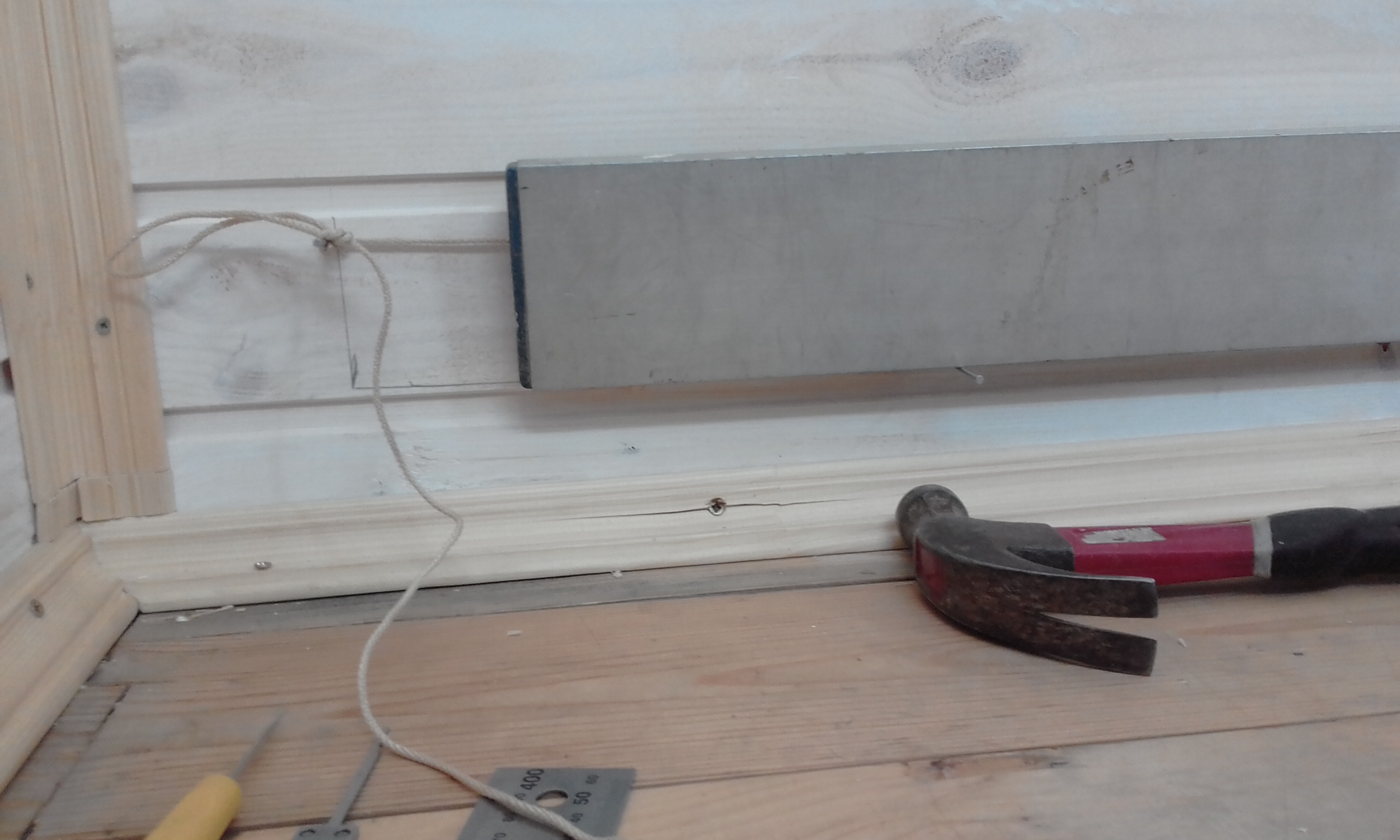 Провёл горизонталь по уровню, установленному на гвоздики. Отложил 2 м, затем 6 см вверх. Провёл линию с уклоном 3%, требуемым для трубы диаметром 50 мм.
