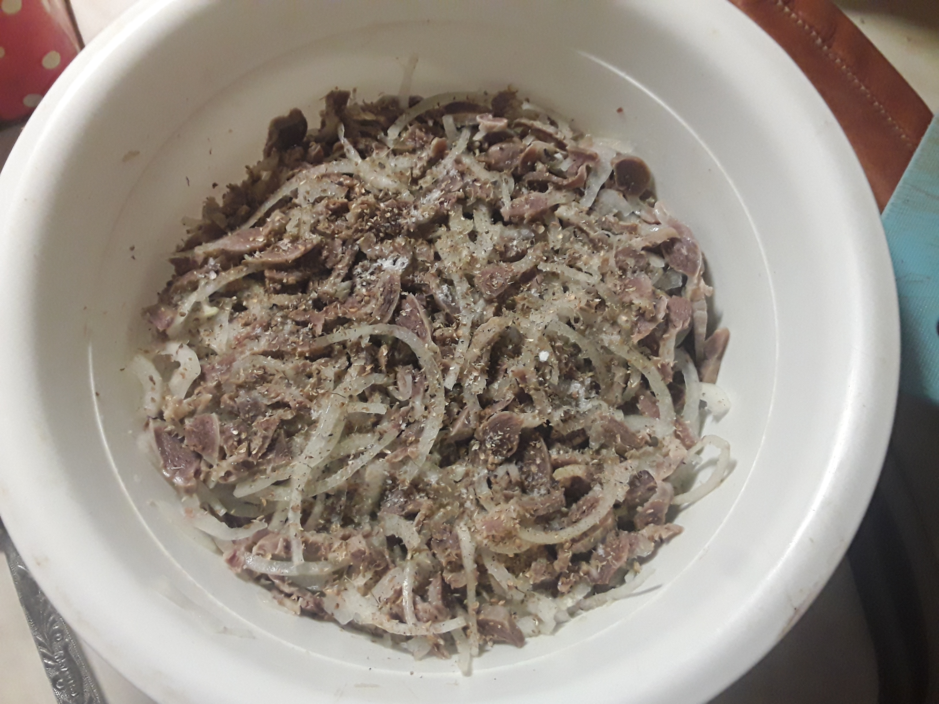После того,как помыли лук,смешиваем с желудками,добавляем соль,кориандр,уксус и перемешиваем,ставим настояться.