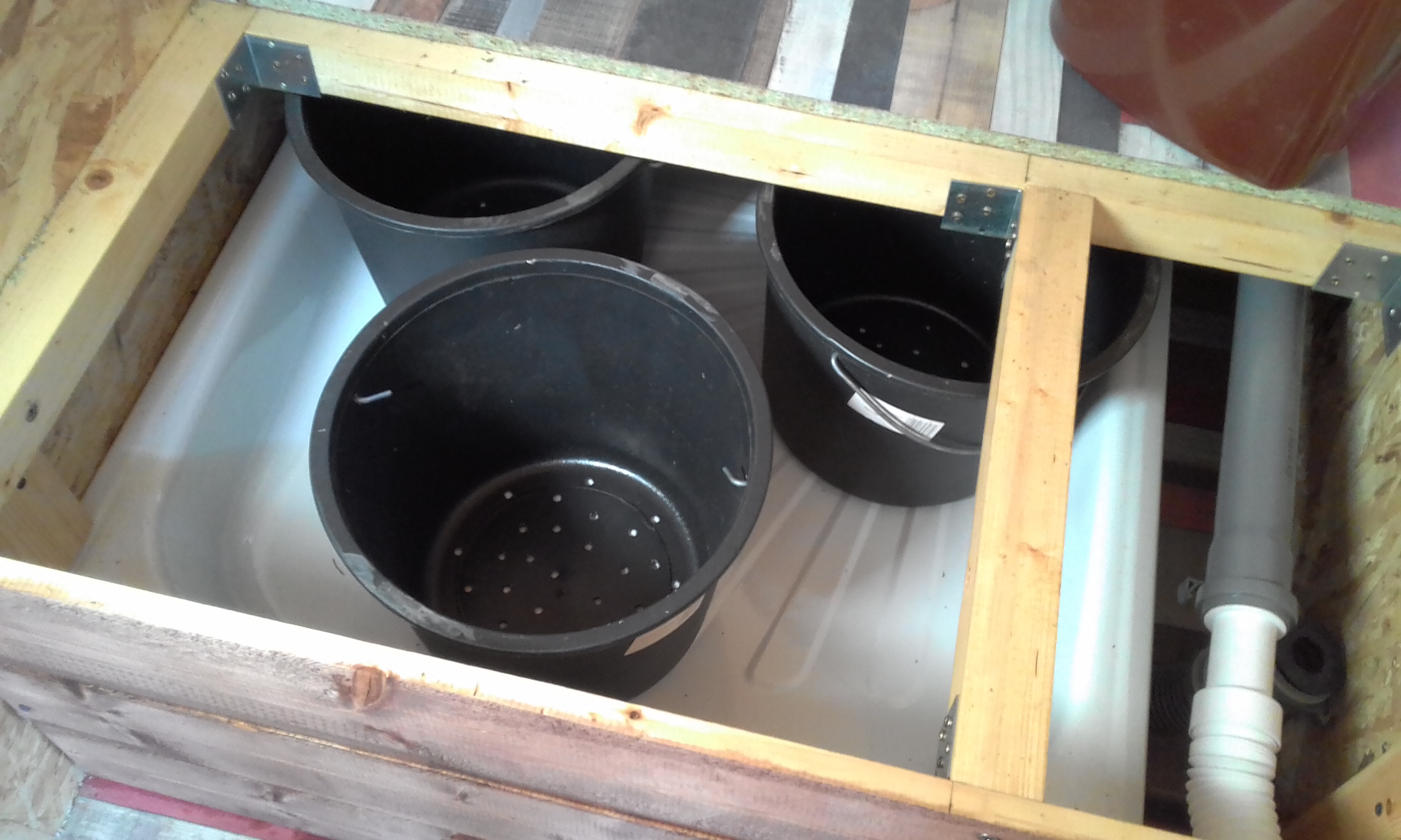 Жидкая фракция из поддона сливается в сифон, а затем попадает в трубы, расположенные под поддоном. Объём труб 3 л. Т.к. эти трубы расположены ниже трассы канализации, мы перекачиваем жидкость из поддонных труб в трассу с помощью ручной трюмной помпы.