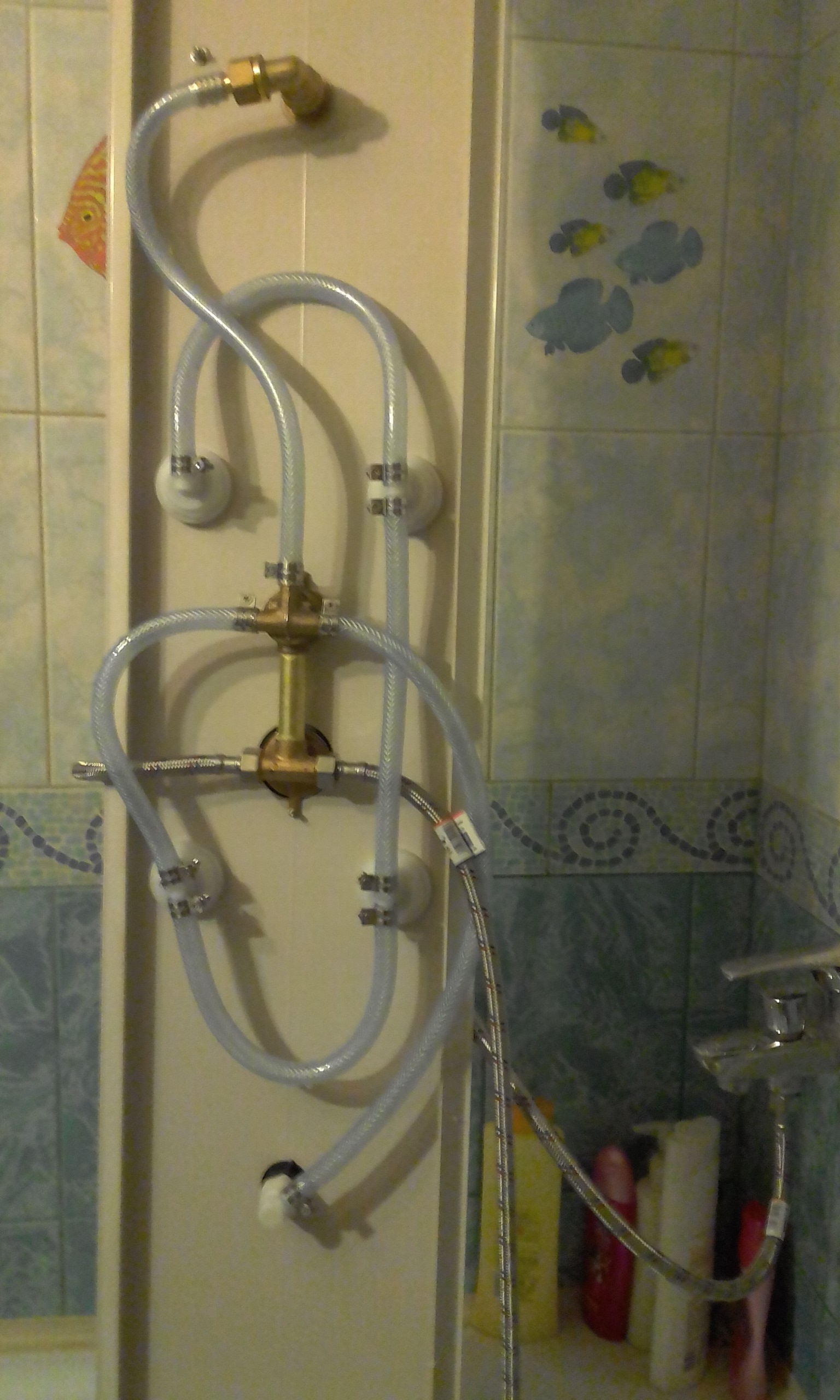 Приборную панель привёз домой, подсоединил гибкую подводку к фланцу душевой лейки и провёл испытания. Протечек нет. Панель можно устанавливать в проектное положение.Есть одна тонкость. Рычаг смесителя надо максимально выставлять наружу. Иначе ему, задвинутому внутрь, не даёт опуститься опорная деталь. Ну что бы китайцам стоило акцентировать на этом внимание? Я рычаг задвинул до конца, чтобы крепче держался и не сразу понял, почему из крана не течет вода.
