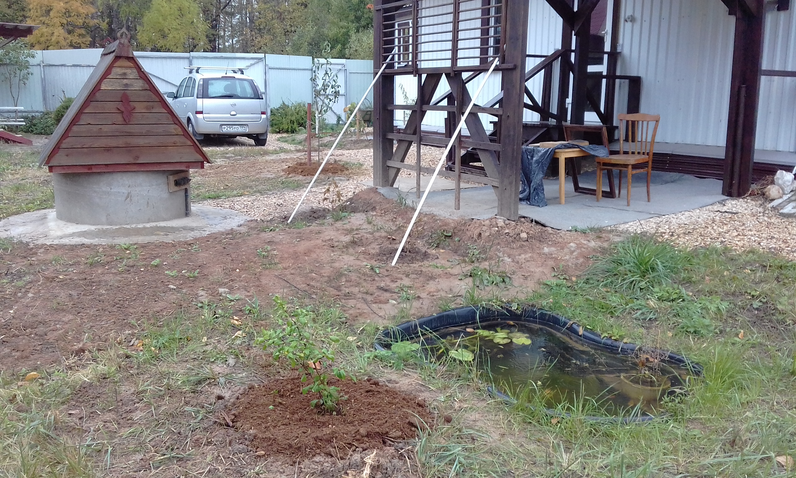 Как только в отдельных местах завершилась вертикальная планировка, так сразу там произвёл посадку деревьев и кустарников. Просто гранд посадки.