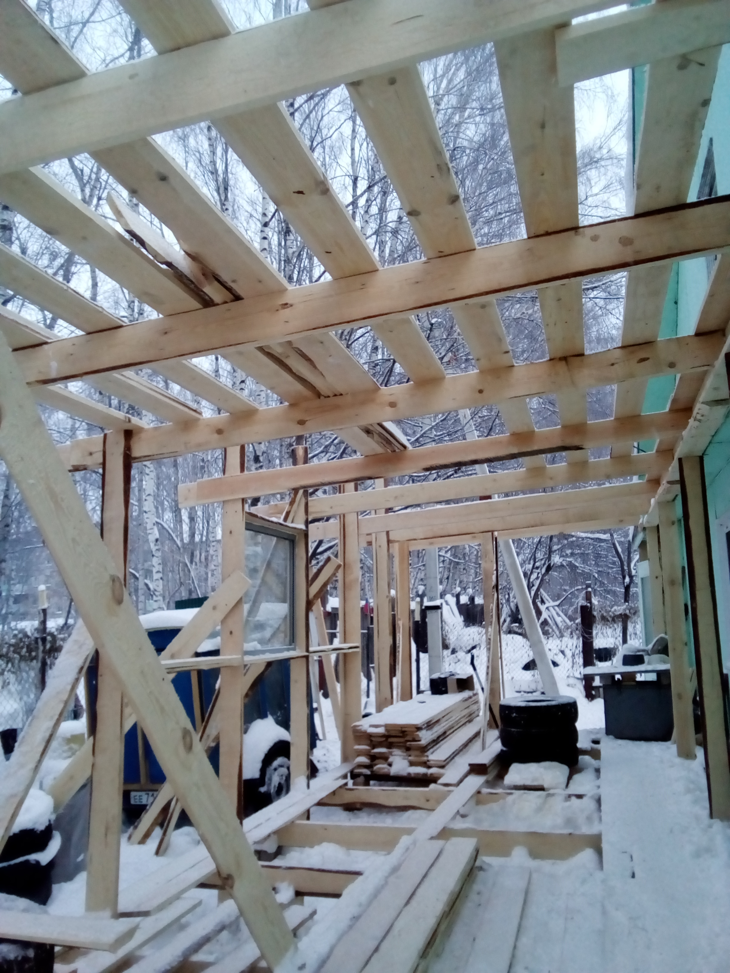 Вот чем мне нравится зимняя стройка - смахнул снежок и строй дальше, любая деревяшка на морозе сохнет, и из какого бы свежего дерева не строил - к весне да под крышей, все высохнет замечательно. Минус - сразу то, что нужно, не пропенишь., руки мерзнут, и аккумулятор быстро сажается. Ну и с подвозом, если что, иногда нужно сначала дорогу чистить. Никакой тебе плесени, отсыревших досок, промокшего утеплителя!