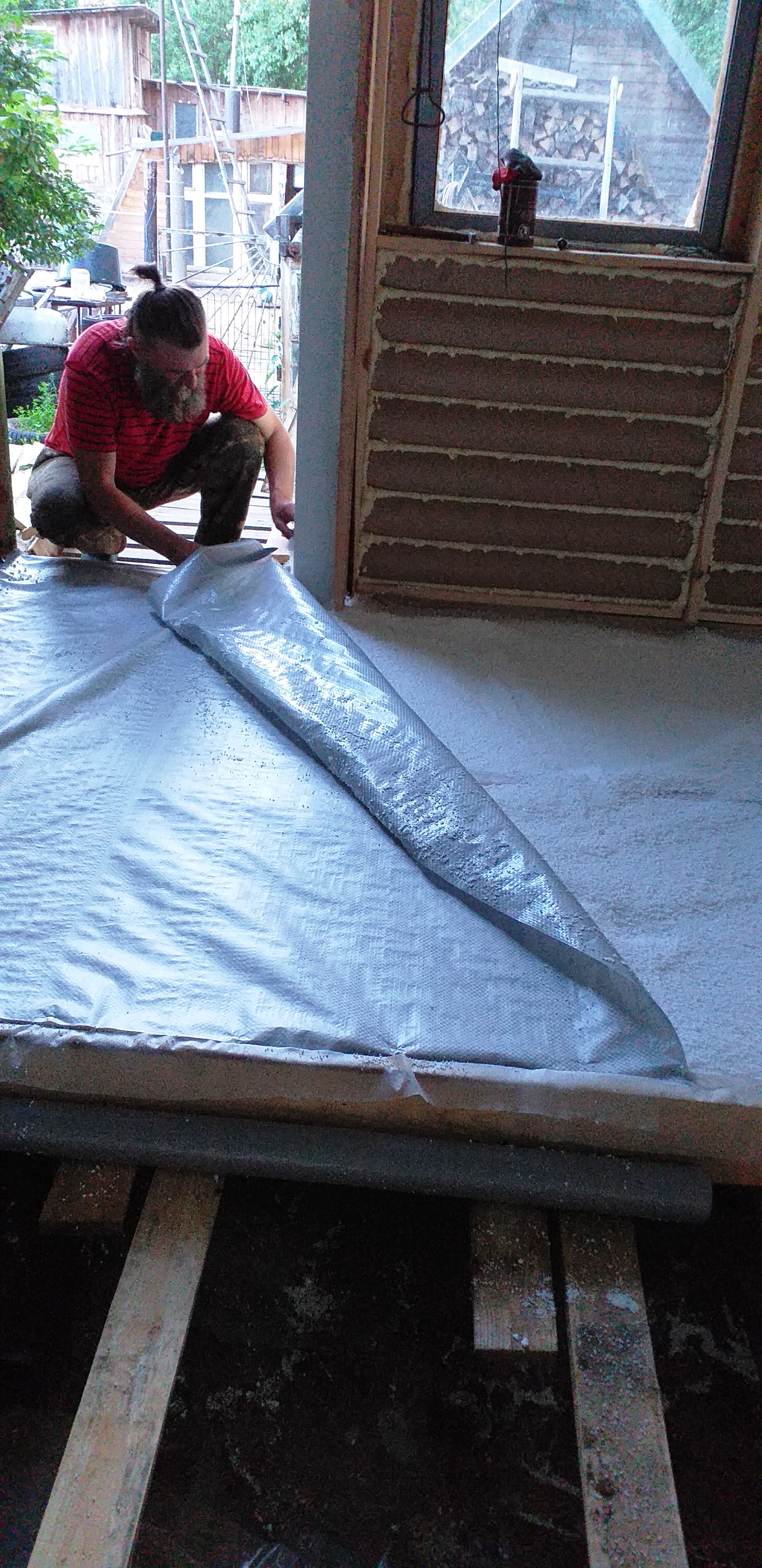 Это опять не кусок стены, а кусок пола.Т.к. у нас достаточно поликарбоната сильно б\у, то мы его кладем под пенопласт. Чтобы поменьше засыпать, укладываем пенопласт сначала полосами, а потом уже засыплем.